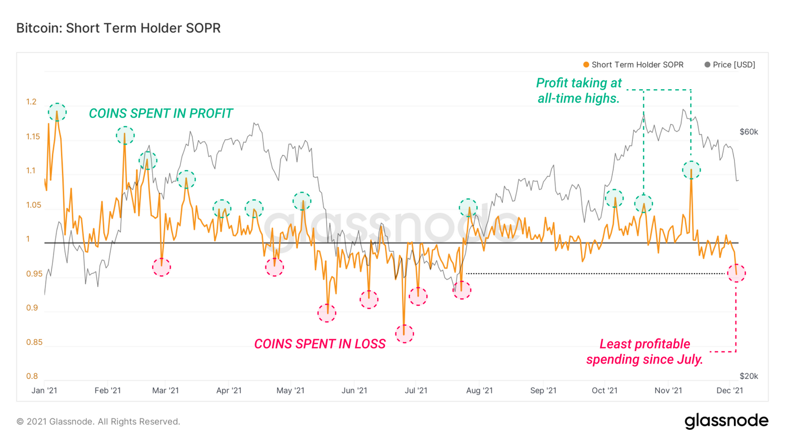 短期持有者SOPR揭示了短期持有者所卖出的比特币的盈利能力。下面的图表可以解释为: