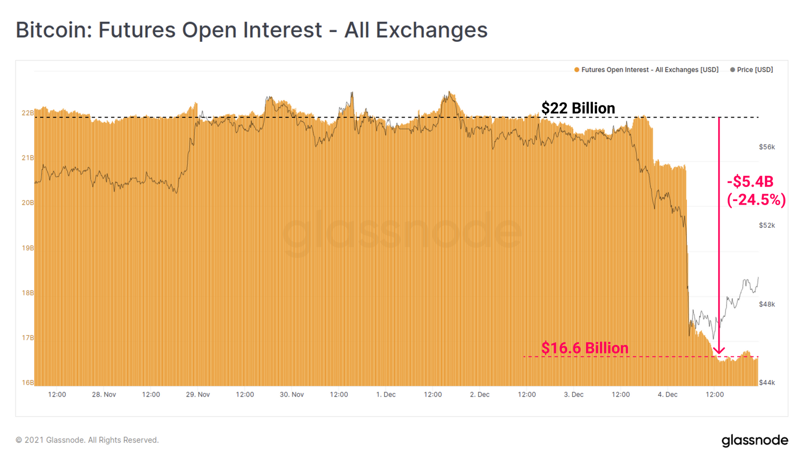 当价格无法获得支撑时,卖压引发了一连串的多头清算。在几个小时内,54亿美元的期货未平仓合约被清算,总价值减少了-24.5%。