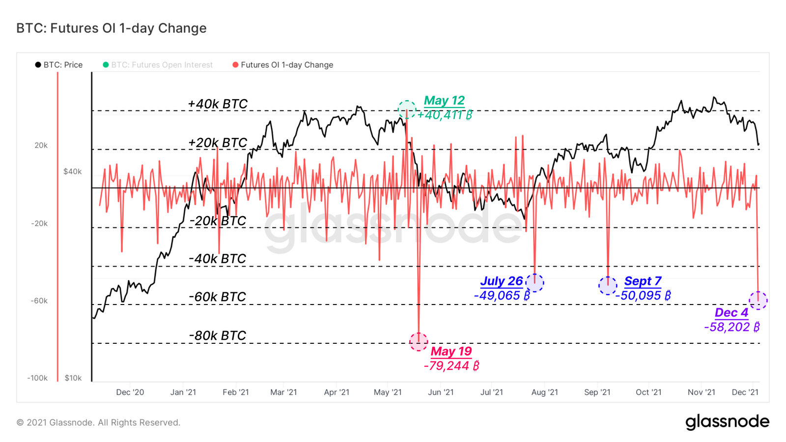 周六一连串的合约清算,总价值达到了58,202枚BTC。以BTC计,这次清算是2021年期货未平仓合约的第二大单日变化,仅次于5月19日的历史性抛售,那次总额为79,244枚BTC。