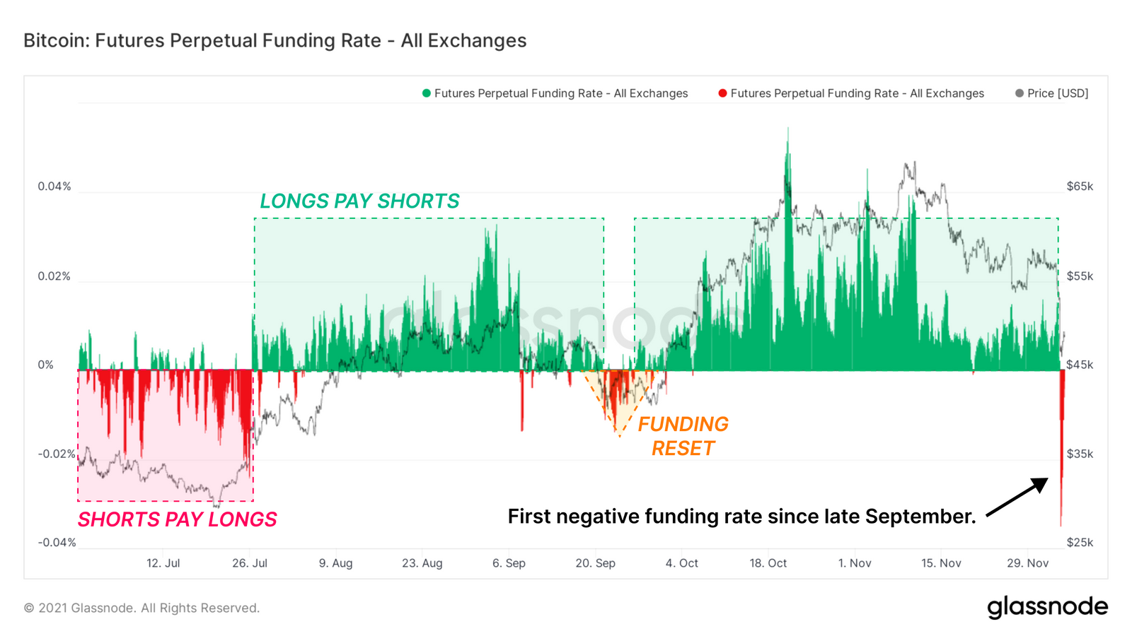 当批量合约被连环爆仓时,清算的力量可以将总的资金推过中位线,并向相反的方向发展,周六正是发生了这种情况。在价值54亿美元的未平仓合约被清算后,永续期货资金利率骤降至-0.035%,显示出资金偏向的完全重置。