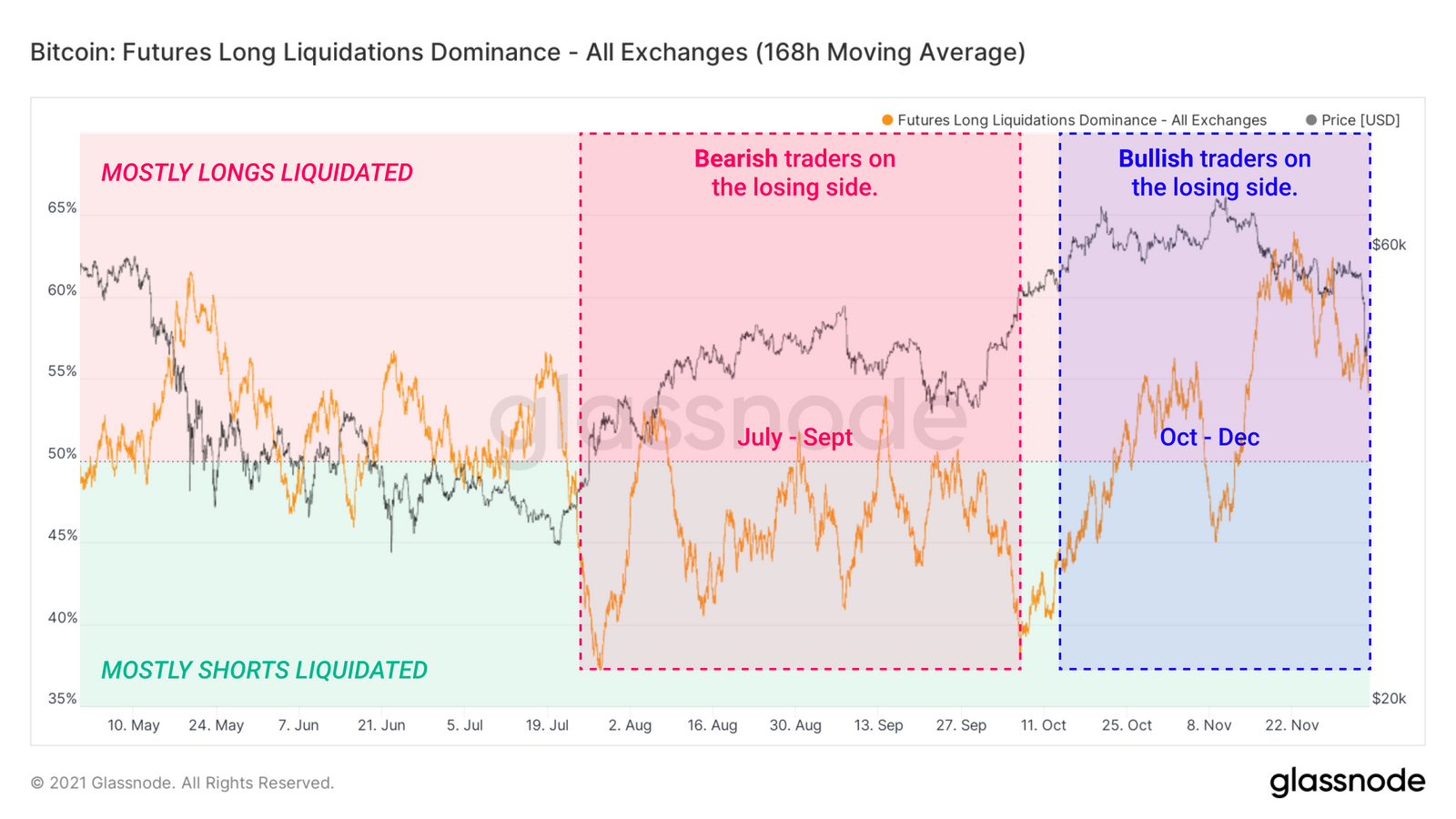 自上次资金重置以来,永续市场已经维持了两个多月的溢价。交易员的信心会随着时间的推移而震荡,监测多头清算主导权的趋势可以洞察到投机者情绪的周期性转变。