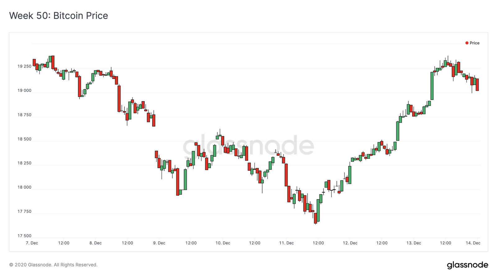以19,360美元的价格开始第50周之后,比特币开始逐渐下降,周五达到周低点17,640美元。不过在这之后,很快就开始反弹,在周末时回到19000美元上方,达到19180美元。
