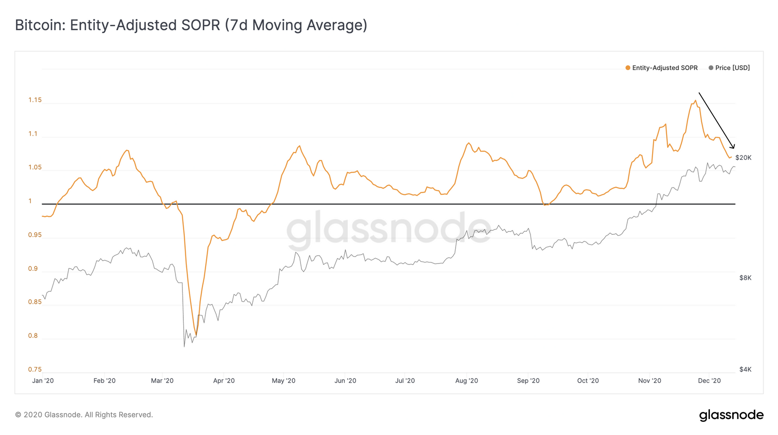 尽管链上有绝大多数看涨信号,但比特币的修正后的实体SOPR指标表明了一些短期的看跌情绪。SOPR显示了比特币持有者在多大程度上是盈利或亏损的,数值高于1表示卖出时,平均来说卖出者都在盈利,而数值低于1则表示卖出时,卖出者平均是亏损的。