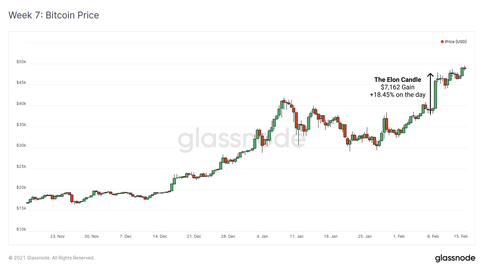 上周初,比特币市场一开盘,特斯拉公司就爆出重大消息,该公司购买了价值15亿美元的比特币,纳入了公司财务资产负债表。消息公布后,比特币/美元汇率立即展示了比特币历史上最大的日线蜡烛,涨幅高达7162美元(当日涨幅+18.45%)。市场将其爱称为 "埃隆蜡烛"。