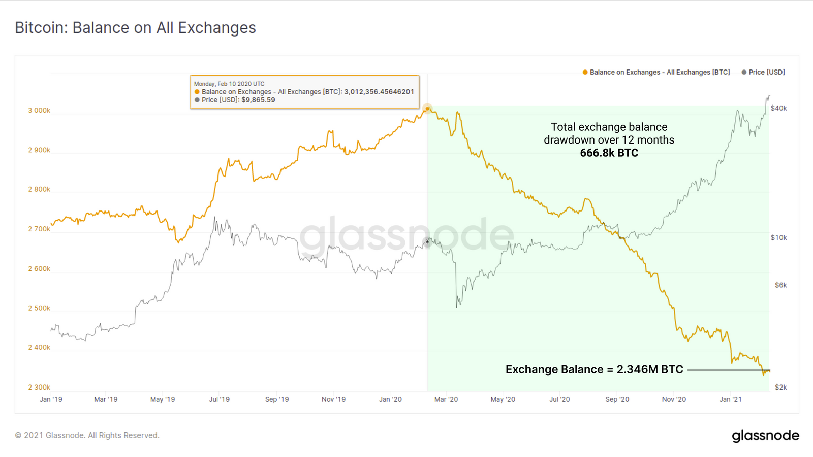 在过去的12个月内,交易所钱包中的比特币余额一直呈现显著下降趋势。交易所余额的历史最高值是在2020年2月11日(301.6万枚比特币),之后共有66.68万枚比特币被提走,相当于交易所持有的比特币余额缩水了22%,只剩下234.6万枚比特币。