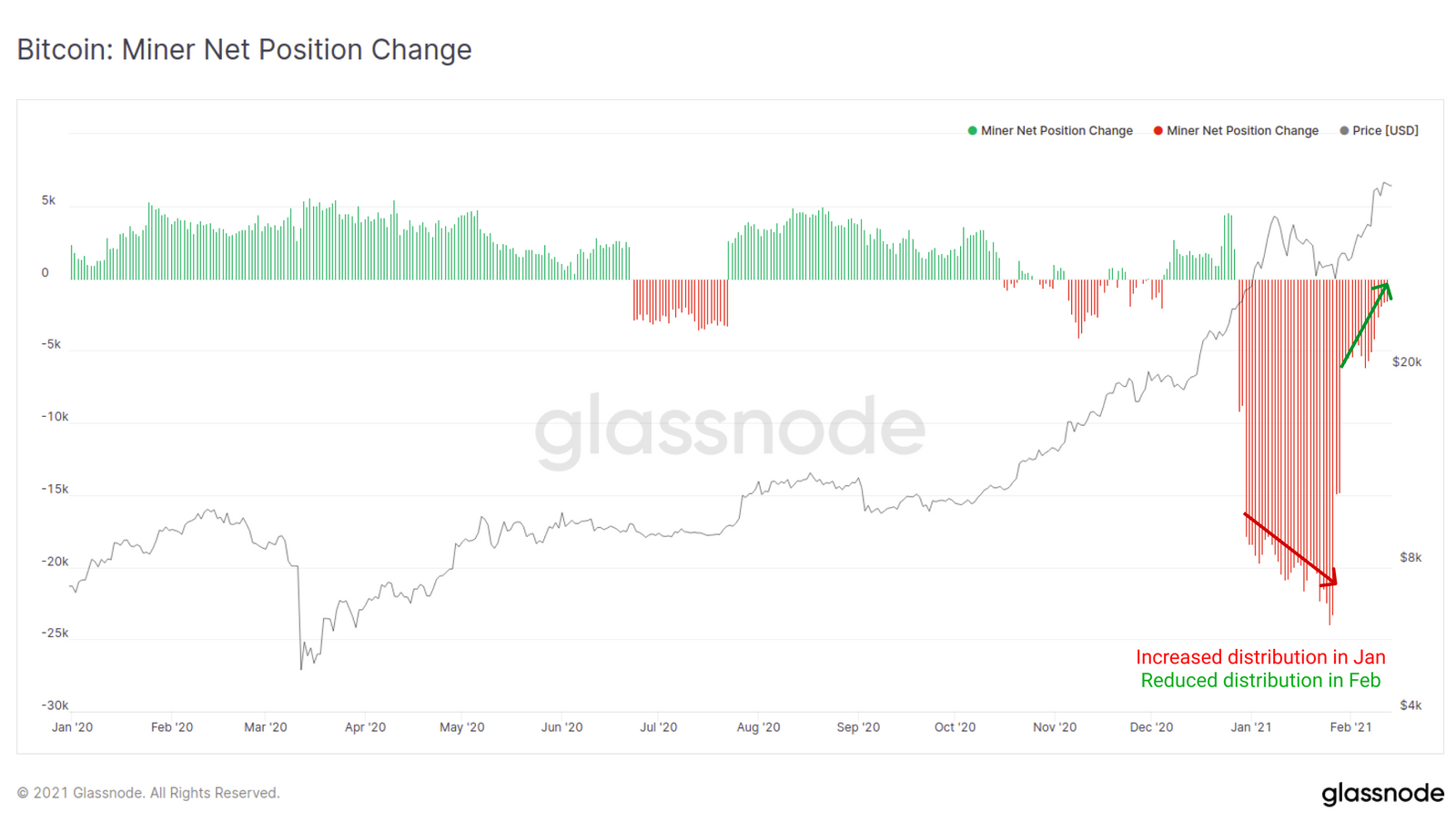 整个一月期间,矿工们经历了币价暴涨以及随后的盘整之后,实际上已经缓解了比特币的卖出压力。这表明矿工们要么已经完成了足够的销售用于覆盖成本,要么也可能意味着矿工们看到特斯拉开始信任比特币之后,更加坚信要紧紧抓住手中的比特币。
