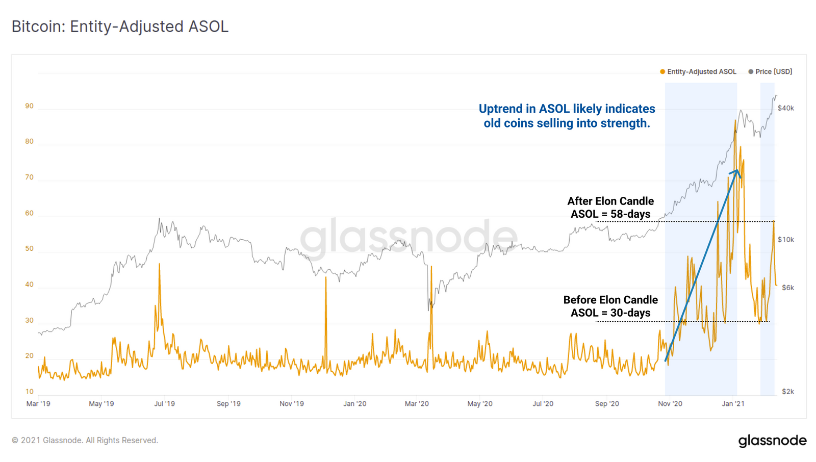 不过,旧币的屯币党们似乎已经利用市场的强势进行比特币的换手,并有可能开始卖出。埃隆蜡烛将比特币的平均币龄从30天提升到58天,如(平均产出币龄指标(ASOL)所示。