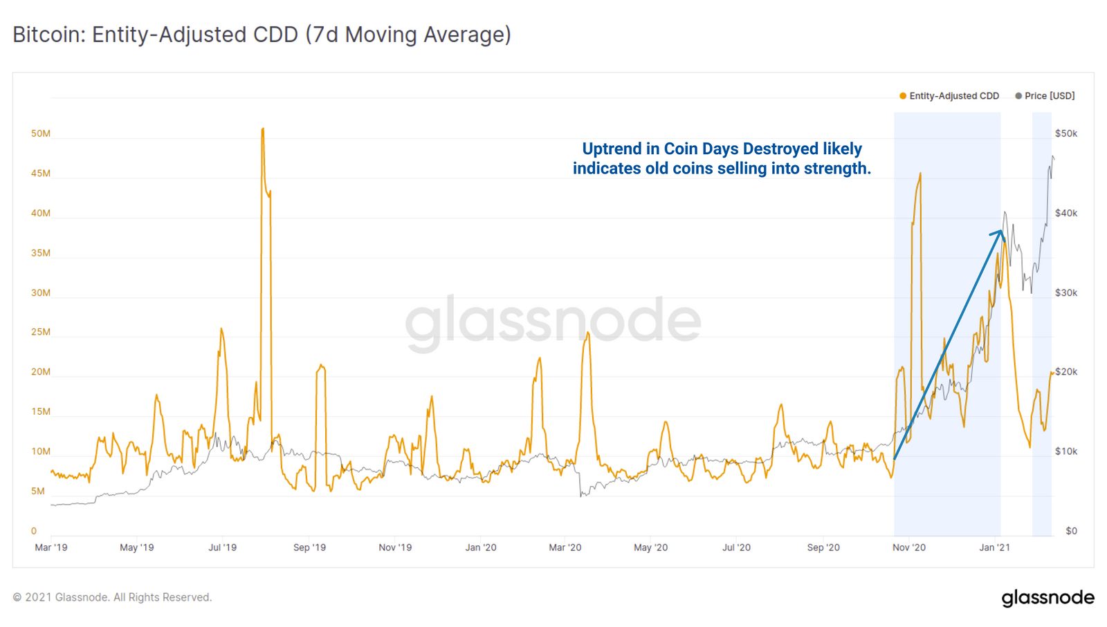 我们也可以对币天销毁指标CDD做出类似的观察,这是一个追踪旧币移动时间的指标。CDD和ASOL指标都表明,自比特币价格在1.2万美元左右时,旧币就一直在移动,而且移动速度越来越快。这种移动在1月份的盘整期间有所放缓,本周又开始加速。