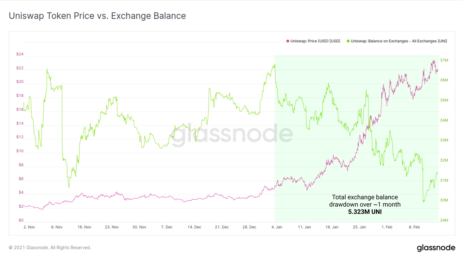另一种表现显著的资产是Uniswap代币(UNI),该代币在交易所的余额也在缩减。在1月初,交易所的UNI余额曾达到3,686万枚的峰值,之后10%的代币流出交易所,约532.3万UNI,从而使价格从6.33美元反弹到23.26美元以上(367%的收益)。