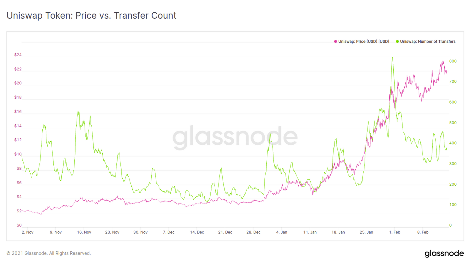 在同一时期,日内UNI代币的交易量增加了三倍,从277tx/小时增加到最高830tx/小时。然而,自2月1日以来,尽管价格持续上涨,但UNI代币的交易量明显放缓。