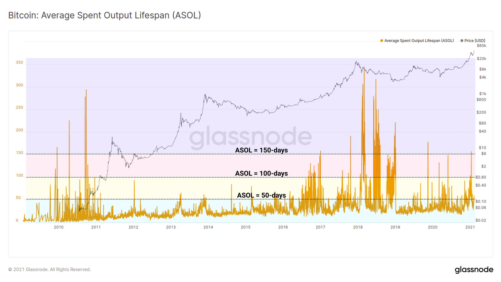 一般来说,较旧的币(即相对较长时间没有移动过的币)都是由对该资产有较高信念的强手持有。每天,ASOL(单位为天)指标都会计算出花费的平均币龄。以下为一些例子: