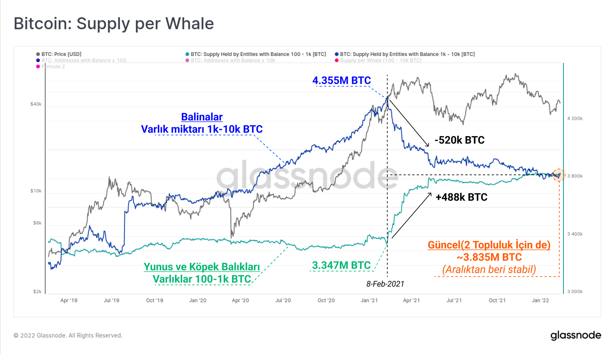 Özetle, bu hafta, yatırımcıların, Mart ayında beklenen Fed faiz artırımlarını dikkatle izleyerek riskten korunmak ve aşağı yönlü işlem açmak için türev piyasalarının az oranda kaldıraç açıldığı dönemi kullandığı görülüyor. Bu arada, genel onchain tedarik dinamikleri dengeli bir biçimde görünmektedir. Hem Uzun Vadeli hem de Kısa Vadeli yatırımcı cüzdan arzları belli bir aralıkta seyrediyor. Madenci bakiyeleri son birkaç hafta içinde toplamda yataydan biraz daha yüksek seyrediyor. Balina arzı (100-10k BTC cüzdanı) Aralık ayından bu yana yatay seyrediyor.