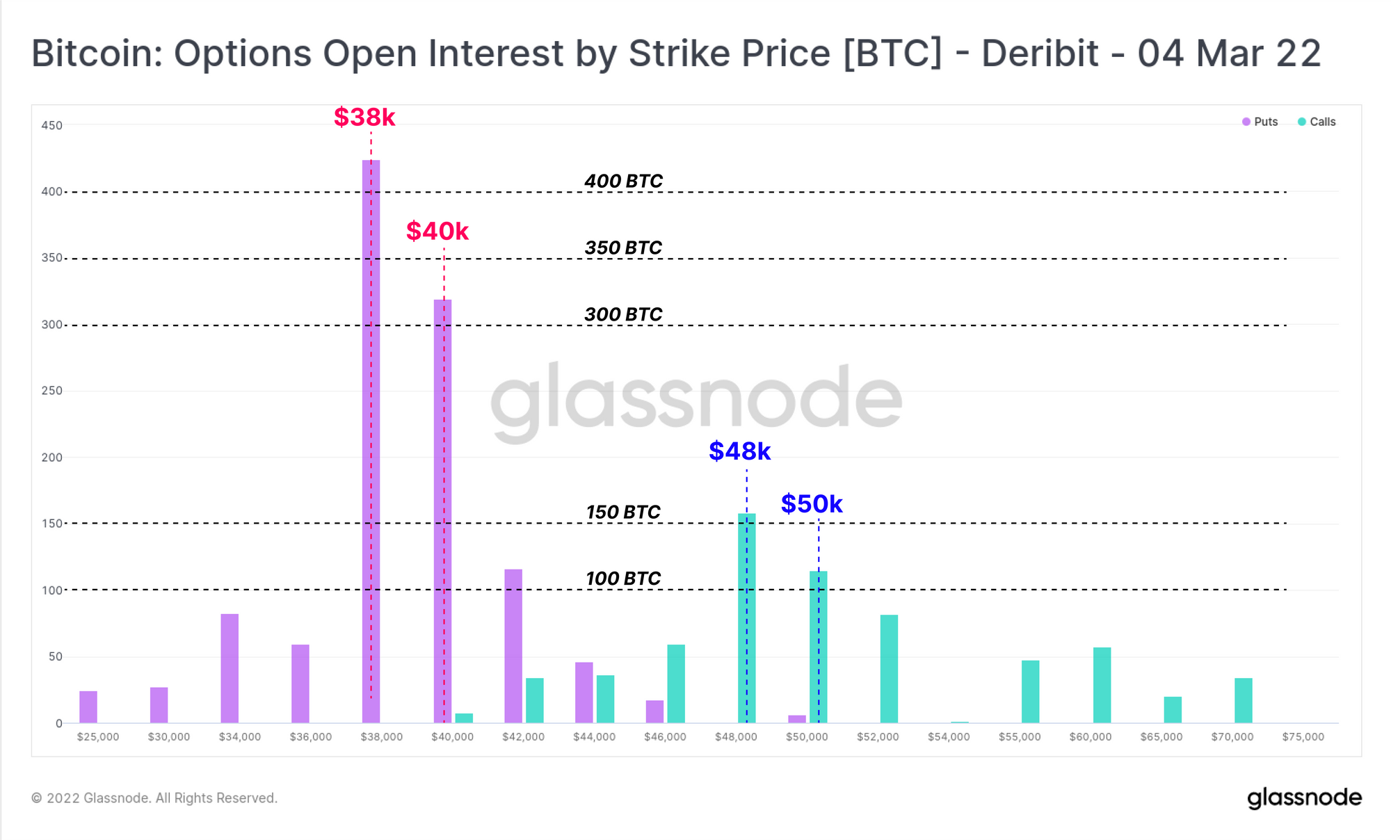 4 Mart sözleşmesi için açık faiz dağılımına bakıldığında da daha yüksek satım/alım hakimiyeti görülüyor. Piyasa, 48 bin ila 50 bin dolar arasındaki en yüksek hacimli alım opsiyonuna ulaştığında 2,5 katından fazlasını taşıyan, 38 bin dolar ile 40 bin dolar arasında bir değere sahip satışları tercih ediyor.