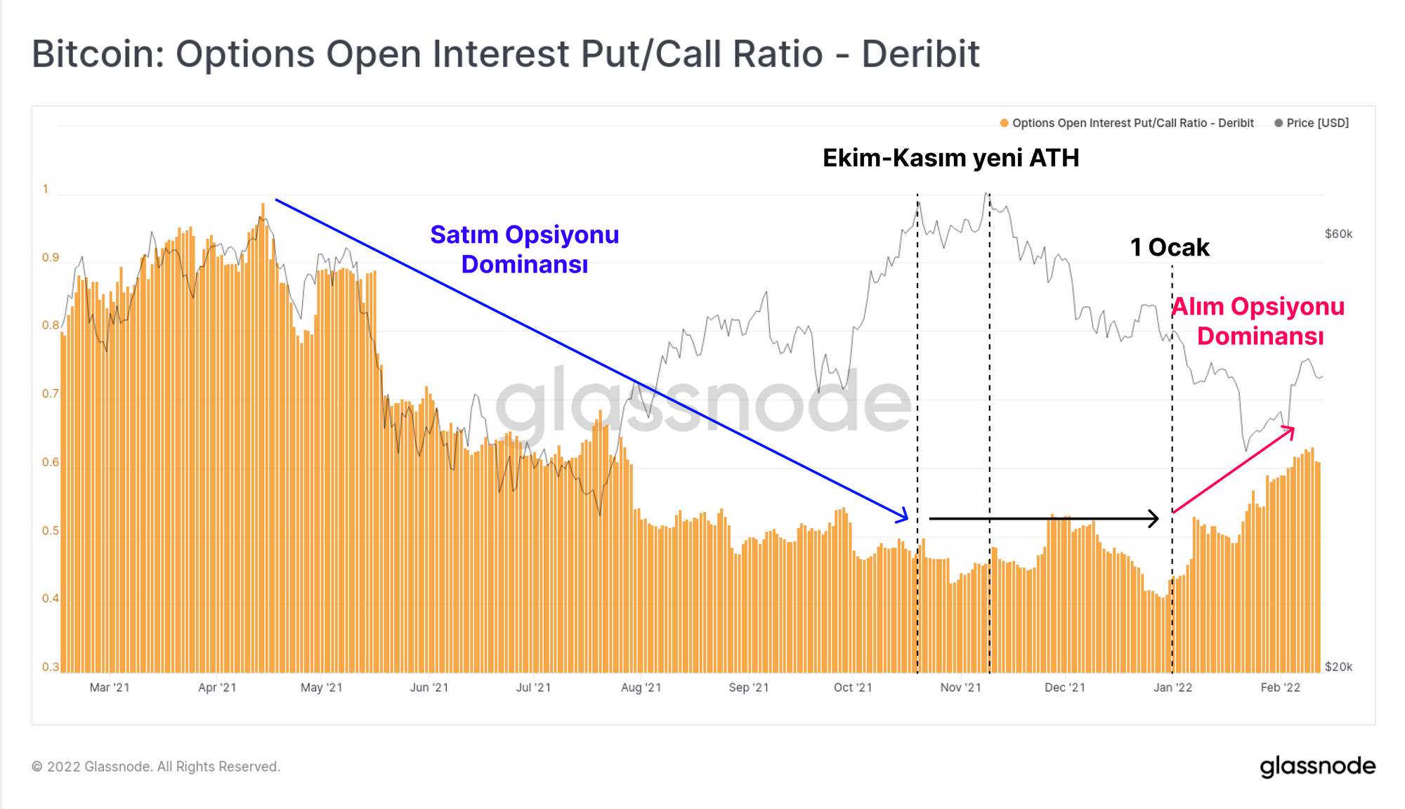 Alım/Satım açık faiz oranının yükselmeye devam etmesiyle satım opsiyonunun daha büyük oranda tercih edildiğini görmekteyiz. Yeni bir yatırımcı duyarlılığı rejiminin göstergesi olan Ekim ve Kasım 2021 ATH'lerini takiben spekülatif alım opsiyonlarını tercih eden yatırımcılardan, güvenli satım opsiyonlarına geçiş oldukça açık.