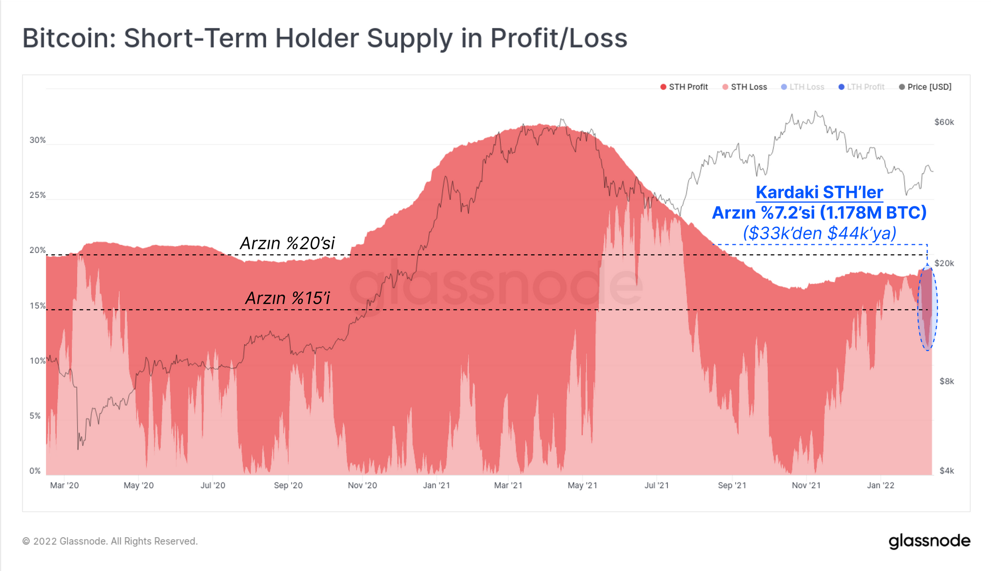 Bu %18,85'in %7,20'si yakın zamanda 44 bin doların üzerindeki fiyat artışı sırasında gerçekleşmemiş bir kara döndü. Bu, fiyatlar 33.5 bin dolar ile 44 bin dolar arasında işlem gördüğü için 1.178 milyon BTC'nin harcandığını (el değiştirdiği varsayılıyor) gösteriyor. Diğer bir deyişle, borsalar dışında tutulan kripto para arzının %7.2'si son üç hafta içinde yeniden birikerek mevcut fiyat aralığında temel talebin bir göstergesi oldu.