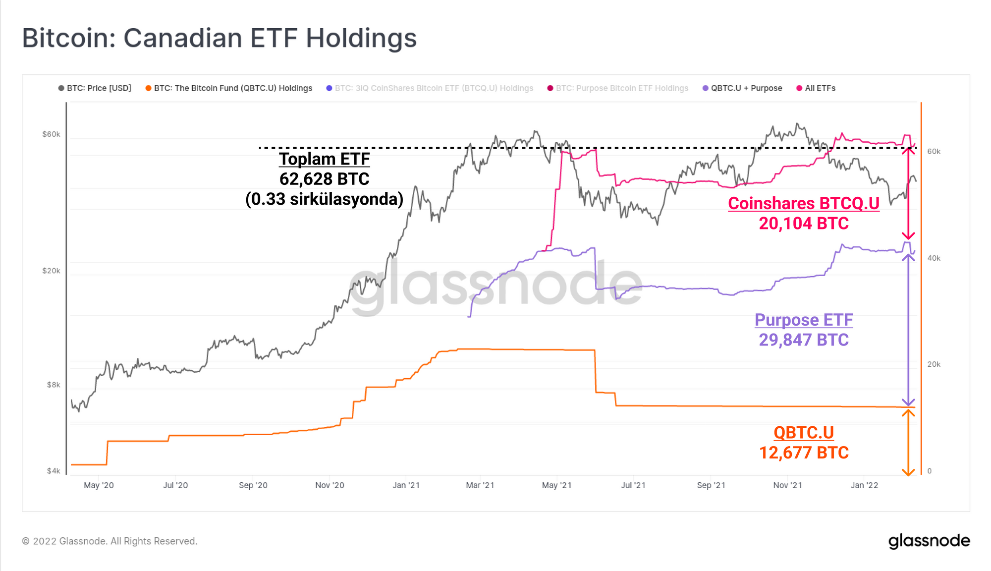 Toplamda bu ETF'ler şu anda dolaşımdaki arzın %0,33'ünü temsil eden, toplam 62.628 BTC'ye sahipken, Purpose Bitcoin ETF'si toplamın %47,6'sını temsil ediyor.