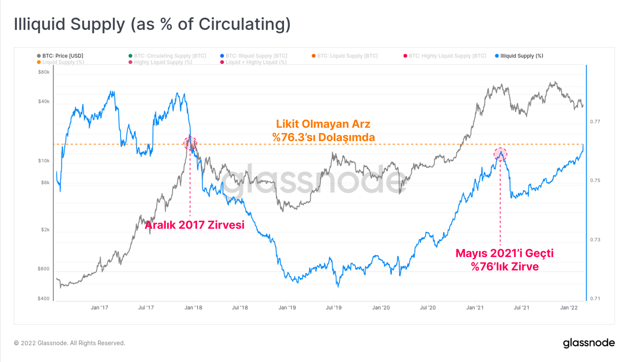 Dolaşımdaki arzın bir oranı olarak, Likit Olmayan Arz şimdi Mayıs 2021 zirvesini geçerek %76.3'e ulaştı. Bu, şimdi 2017 piyasa zirvesi ile aynı seviyeye geri döndü ve kripto para cüzdan likiditesinde dört yıllık bir artışı tersine çevirdi. Bununla birlikte, bu örneklerin her ikisinin de büyük satış olaylarından önce geldiğine dikkat edin, bu nedenle bu madeni paraların gerçekten soğuk cüzdanlarda olup olmadığı görülecektir.