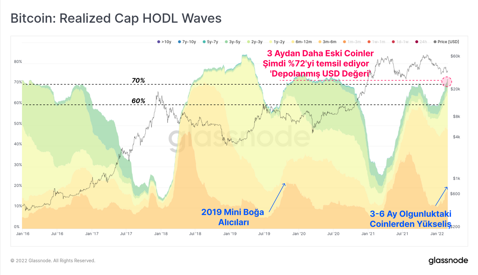 Benzer bir hikaye anlatan Realized Cap HODL dalga bandı 3 aydan daha eski %72'lik yeni yerel zirvelere doğru ilerliyor. Bu, 'Bitcoin'de depolanan' USD değerinin %72'sinin 3 ay ve daha eski kripto paralarda tutulduğu anlamına gelir.
