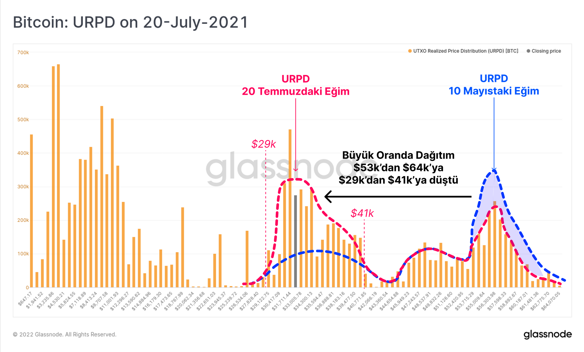 Bu analize, onchainde son hareket ettiği fiyat üzerinden coin arzının dağılımını gösteren URPD metriğini derinlemesine inceleyerek başlayacağız. Burada keşfetmek istediğimiz şey, bu düşüş sırasındaki yatırımcı davranışları arasındaki benzerlikler ve farklılıklar, Mayıs-Temmuz 2021'deki benzer ölçekte.