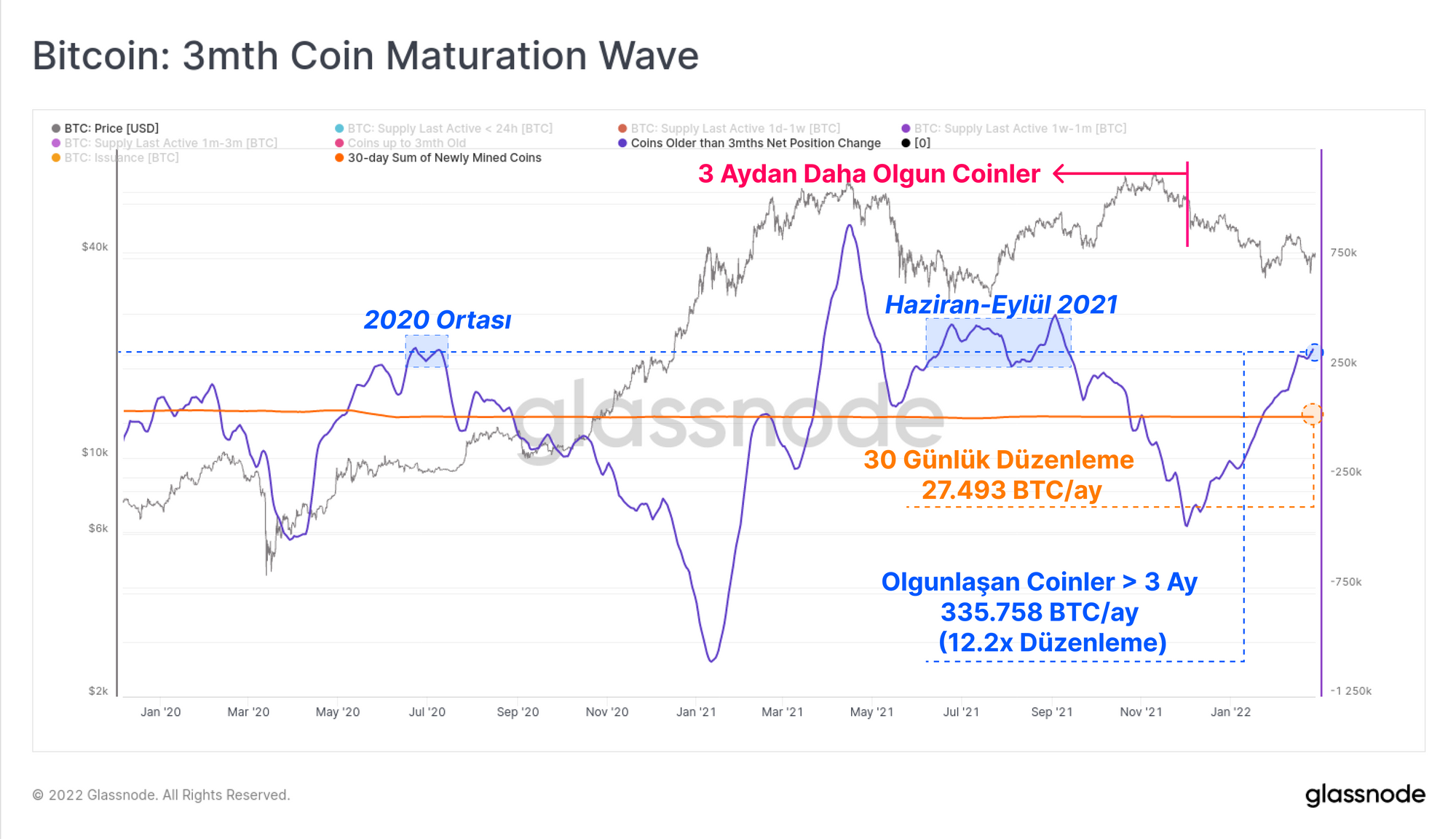 Şu anda, 335 binden fazla BTC, madencilere verilen günlük payın 12,2 katı olan 30 günde 3 ay+ yaşına kadar olgunlaşıyor. Her ikisi de güçlü yukarı yönlü hareketlerden önce gelen 2020'nin ortalarında ve Haziran-Eylül 2021'de benzer bir HODLing davranışı gözlendi.