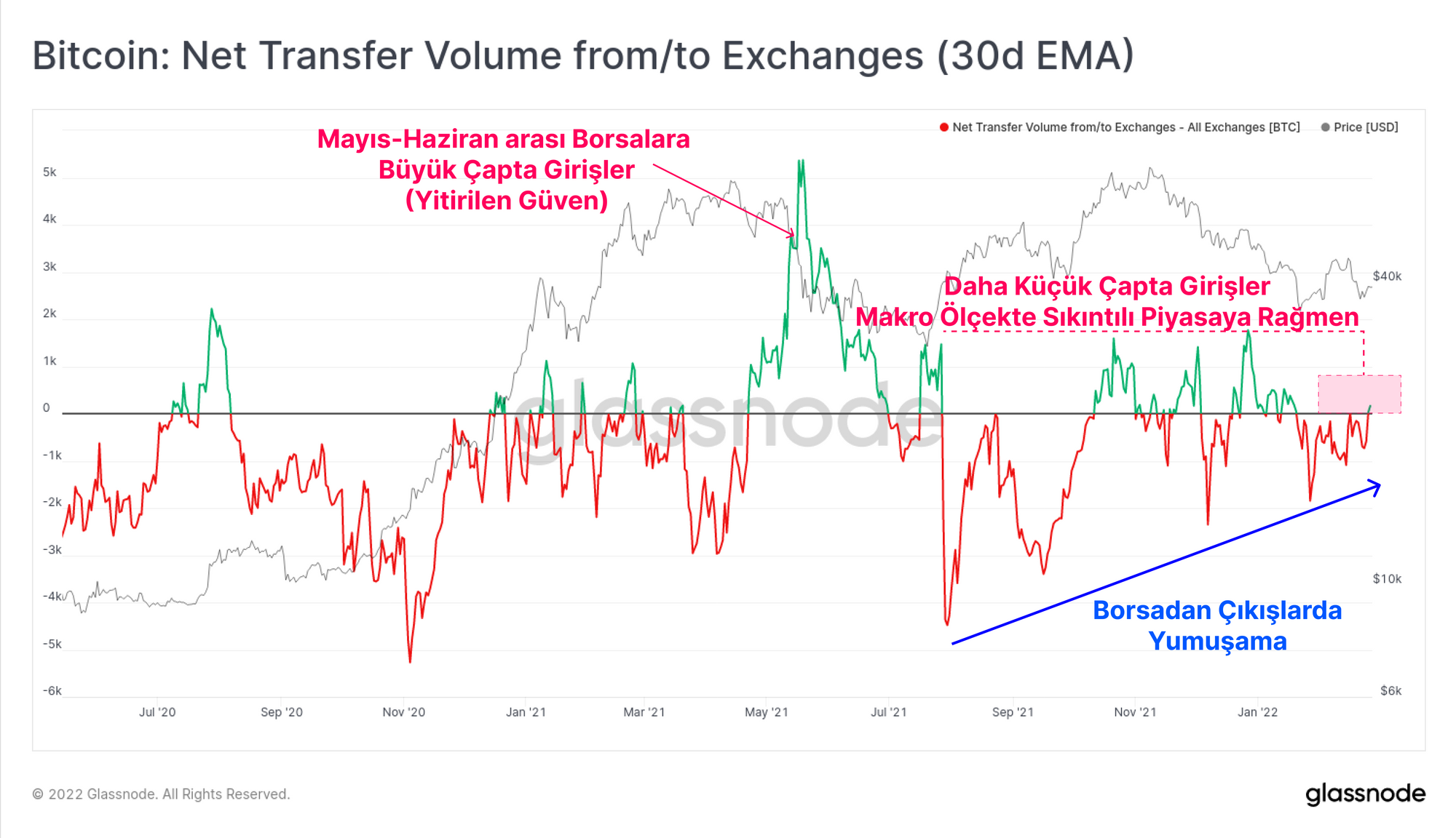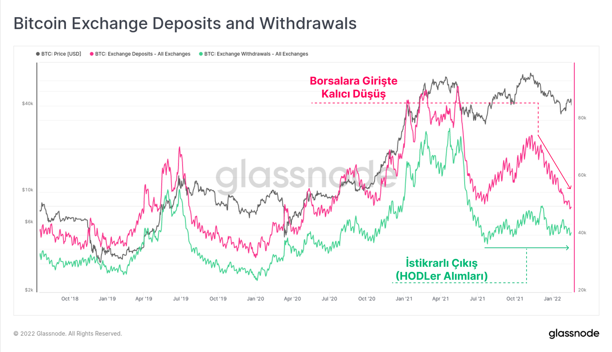 Ayrıca, Kasım ATH'de 74 bin / gün olan borsalara (pembe) para yatıran yatırımcı sayısında bugün 41 bin / gün'e düşen kalıcı bir düşüş gördük. Bu esnada, borsalardan çekimler de günde yaklaşık 40k ila 48k arasında çok sabit kalıyor, bu da yine her halükarda tutarlı bir HODLer topluluğunun göstergesi olarak yorumlanabilir.