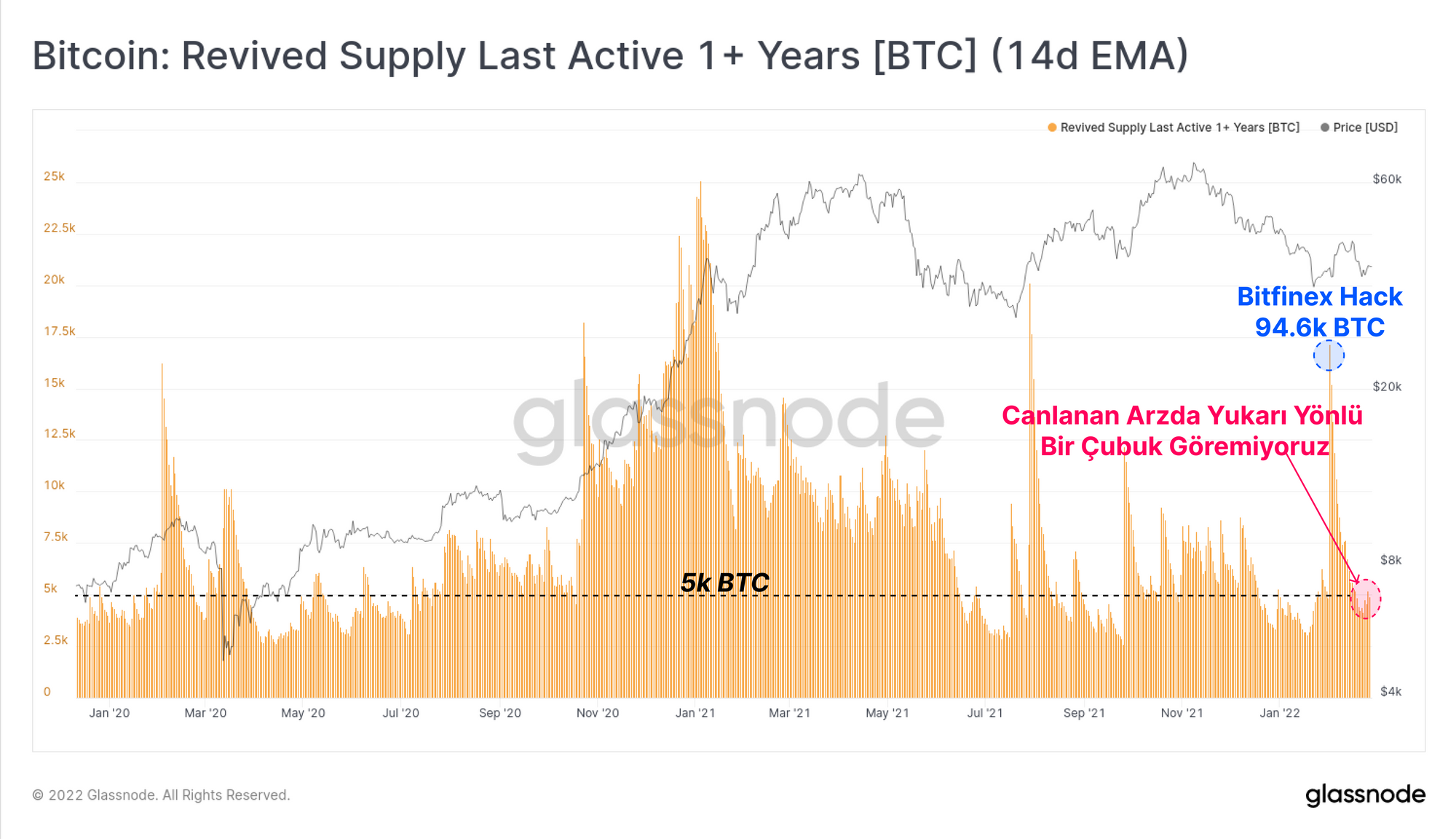 Bunu, bu hafta harcanan 1 yıldan eski kripto paraların hacmine bakarak canlandırılan arz metriğinde de görebiliriz. Bitcoin HODLer topluluğu arasında yaygın bir inanç kaybı olsaydı, bu metriğin önemli bir artış görmesini beklerdik.