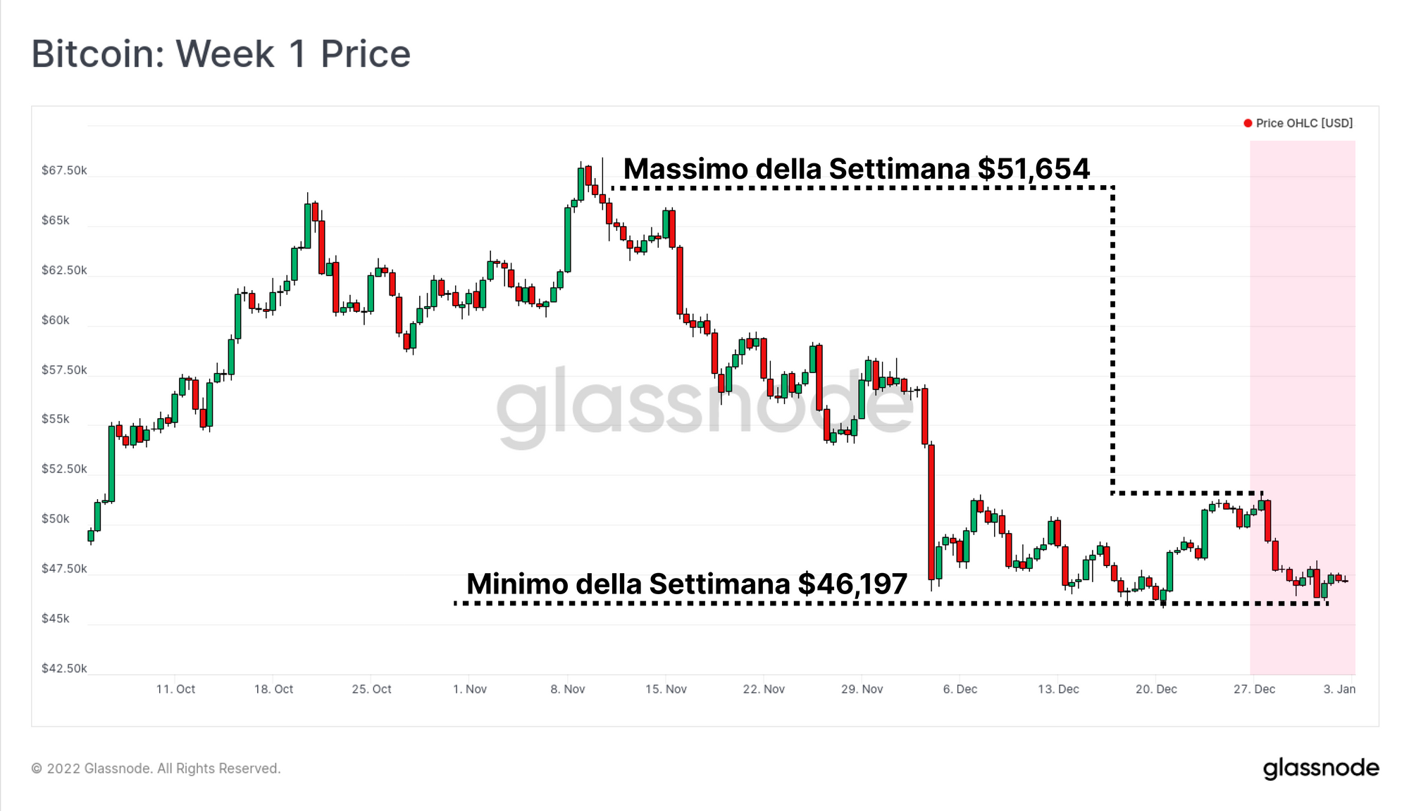 Con la fine del 2021, è andata calando l’attività sul mercato Bitcoin, con volumi di scambio in calo e prezzi che si muovono più o meno lateralmente. Il prezzo ha continuato a lateralizzare nello stesso range dalla fine di Novembre, rimbalzando questa settimana tra un massimo di $51,654 ed un minimo di $46,197.