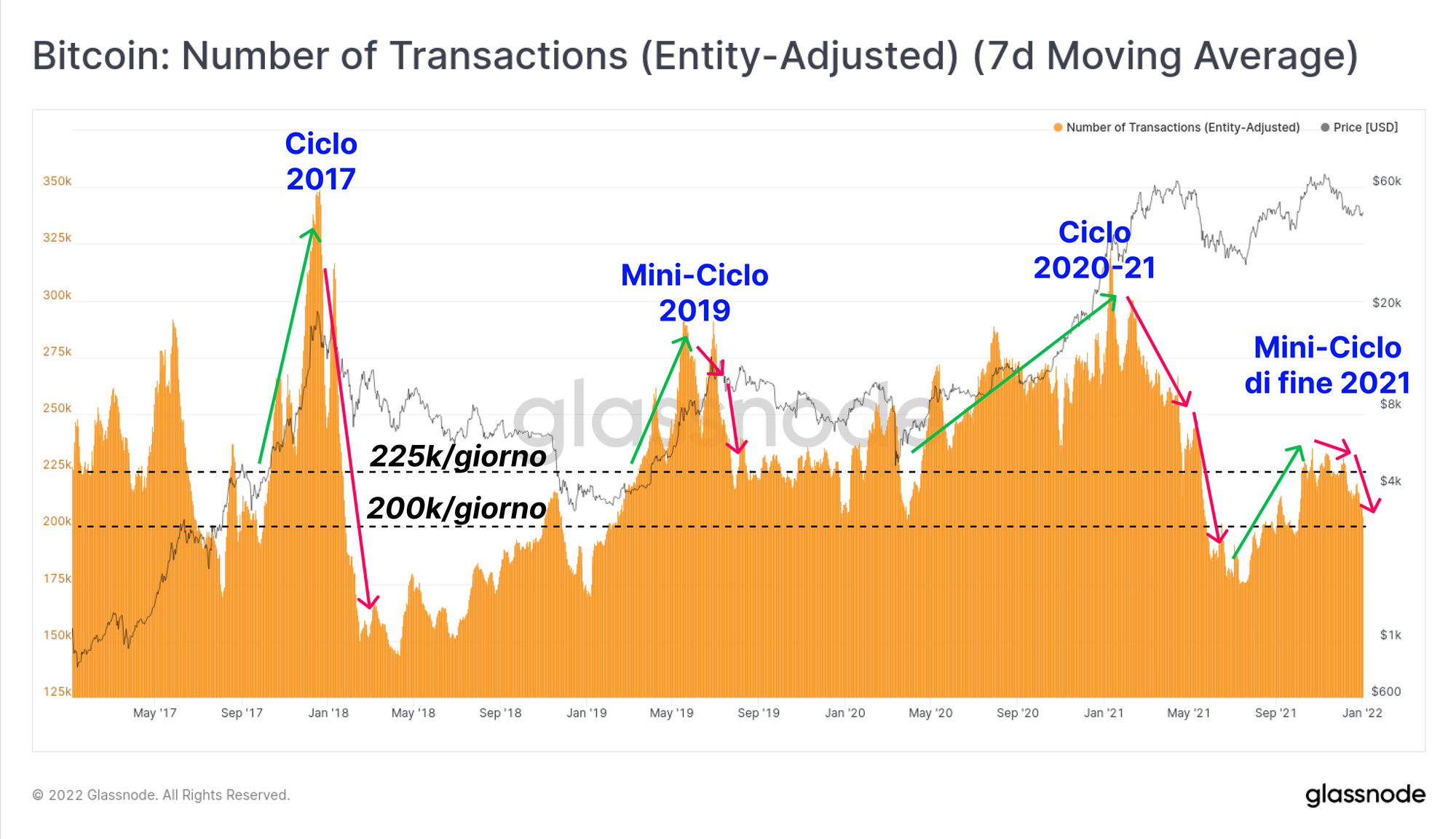 Un'immagine simile ci è data dal numero di transazioni, con i bull market del 2017 e del 2020-21 che spiccano in modo evidente, raggiungendo picchi di 300k transazioni al giorno. Ancora una volta, possiamo trovare delle similitudini tra aprile-agosto 2019 e il mercato attuale da settembre 2021 a questa parte. In entrambi i casi vi è stata un’iniziale esplosione di attività che ha supportato prezzi crescenti, ma che ha fallito nel sostenere un qualsiasi momentum significativo, portando infine ad un declino sia del numero di transazioni che dei prezzi stessi.