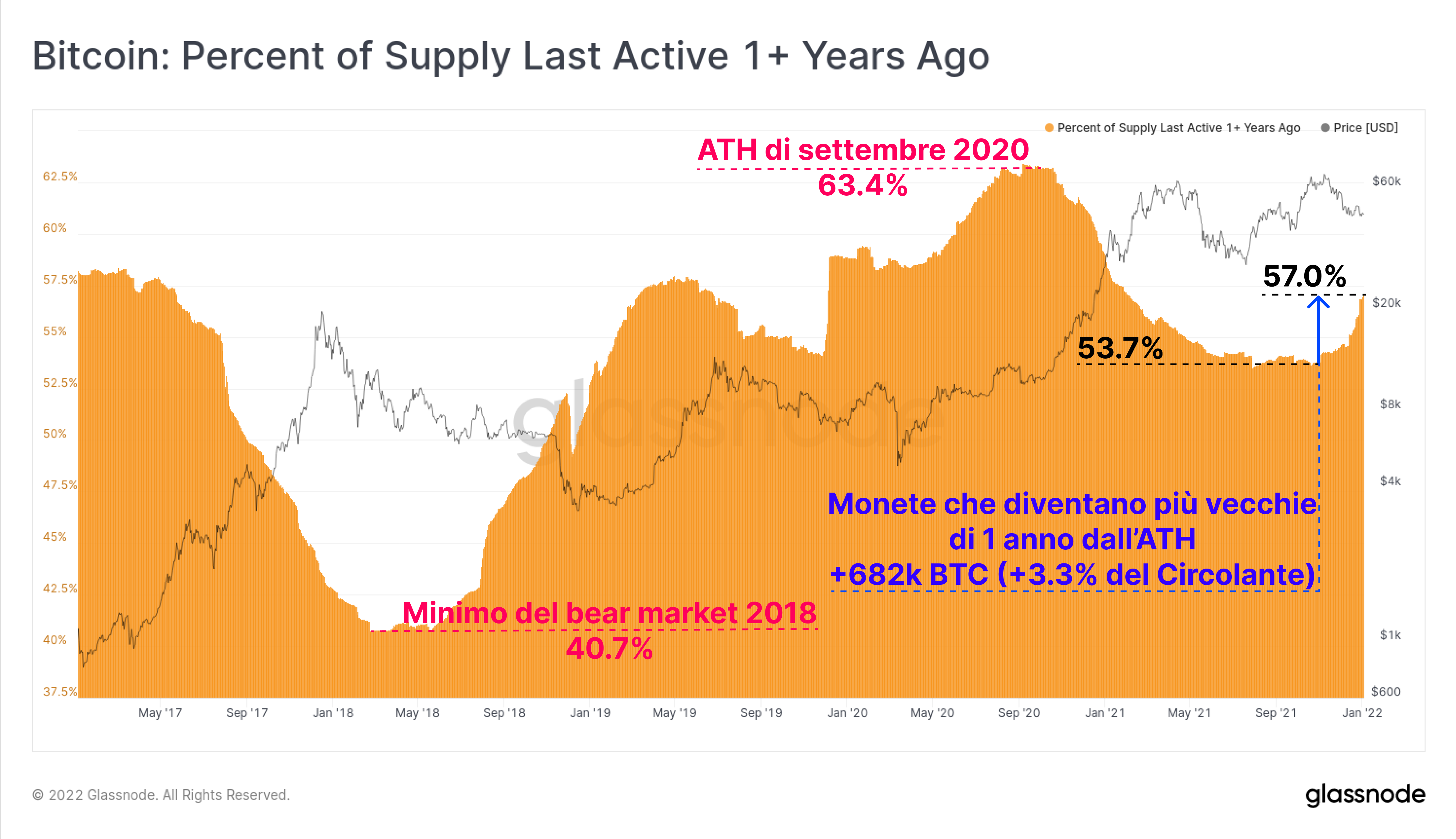 Se osserviamo la metrica della supply inattiva da almeno 1 anno, possiamo notare che molte delle monete accumulate a fine 2020, ad oggi non sono ancora state spese. Da ottobre 2021 infatti, più di 682k BTC sono migrati nella fascia delle monete inattive da almeno 1 anno, rappresentando il 3.3% del circolante. Più del 57% dell’offerta è ora più vecchia di 1 anno, similmente al 51.5% visto durante l’impulso rialzista di aprile 2019.