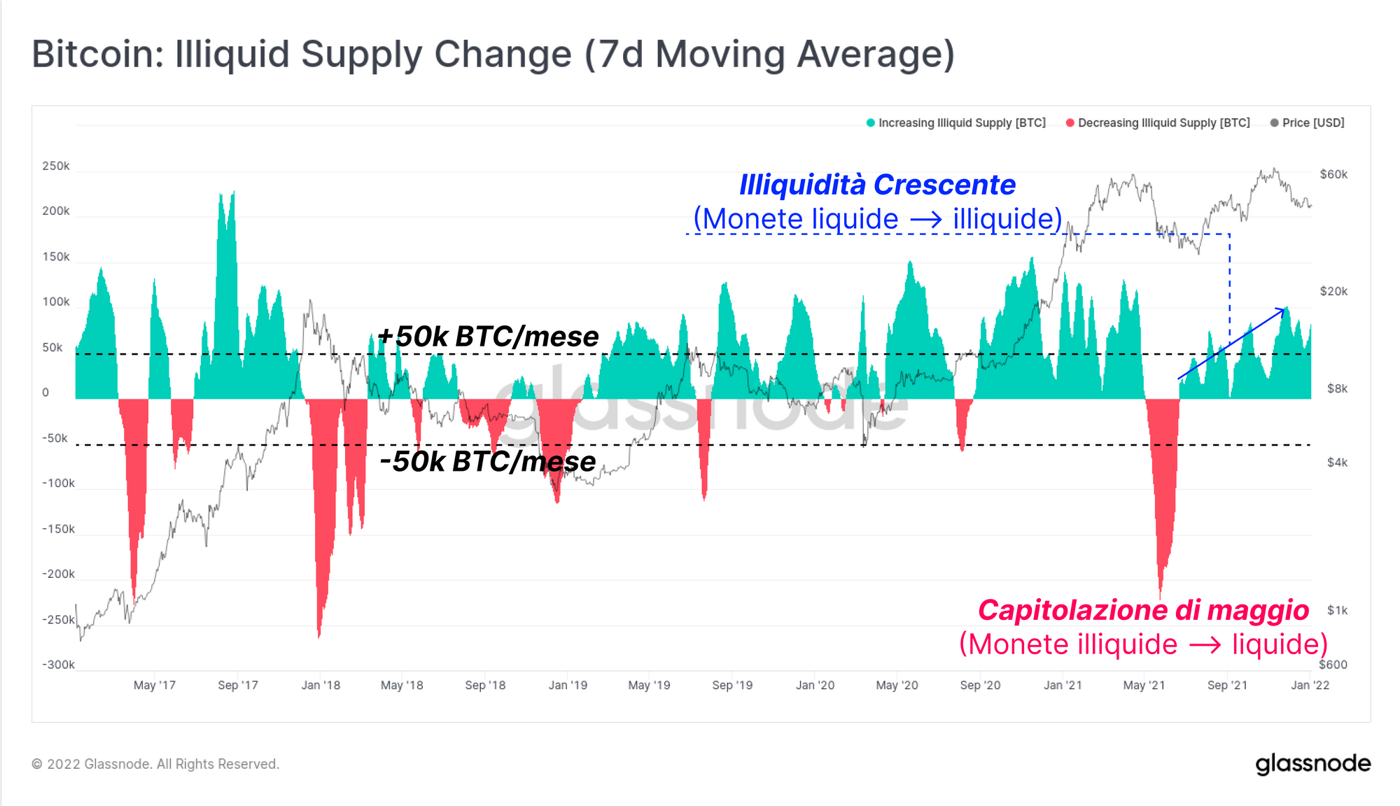 Possiamo vedere qui sotto che durante gli ultimi mesi del 2021, anche durante la correzione, vi è stata un’accelerazione di monete transitate da wallet liquidi a wallet illiquidi. Nel corso di dicembre, le monete si sono spostate verso wallet sempre più illiquidi ad un tasso tra i 50k e i 100k BTC al mese, riflettendo quindi una maggiore probabilità di una più ampia accumulazione.