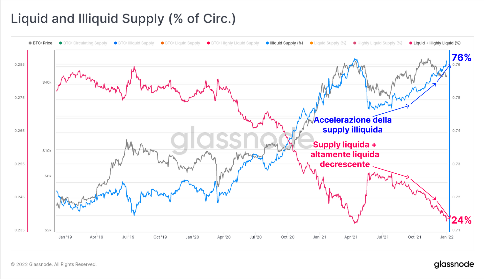 Possiamo notare che l’offerta illiquida (blu) ha accelerato al rialzo, alle spese dell’offerta liquida ed altamente liquida (rosa). Le monete illiquide rappresentano ora il 76% dell’offerta totale, e si può osservare come siano evidentemente correlate al prezzo. La situazione attuale mostra una divergenza tra quelle che sembrano dinamiche costruttive d’offerta onchain e una price action ribassista o al più neutrale.