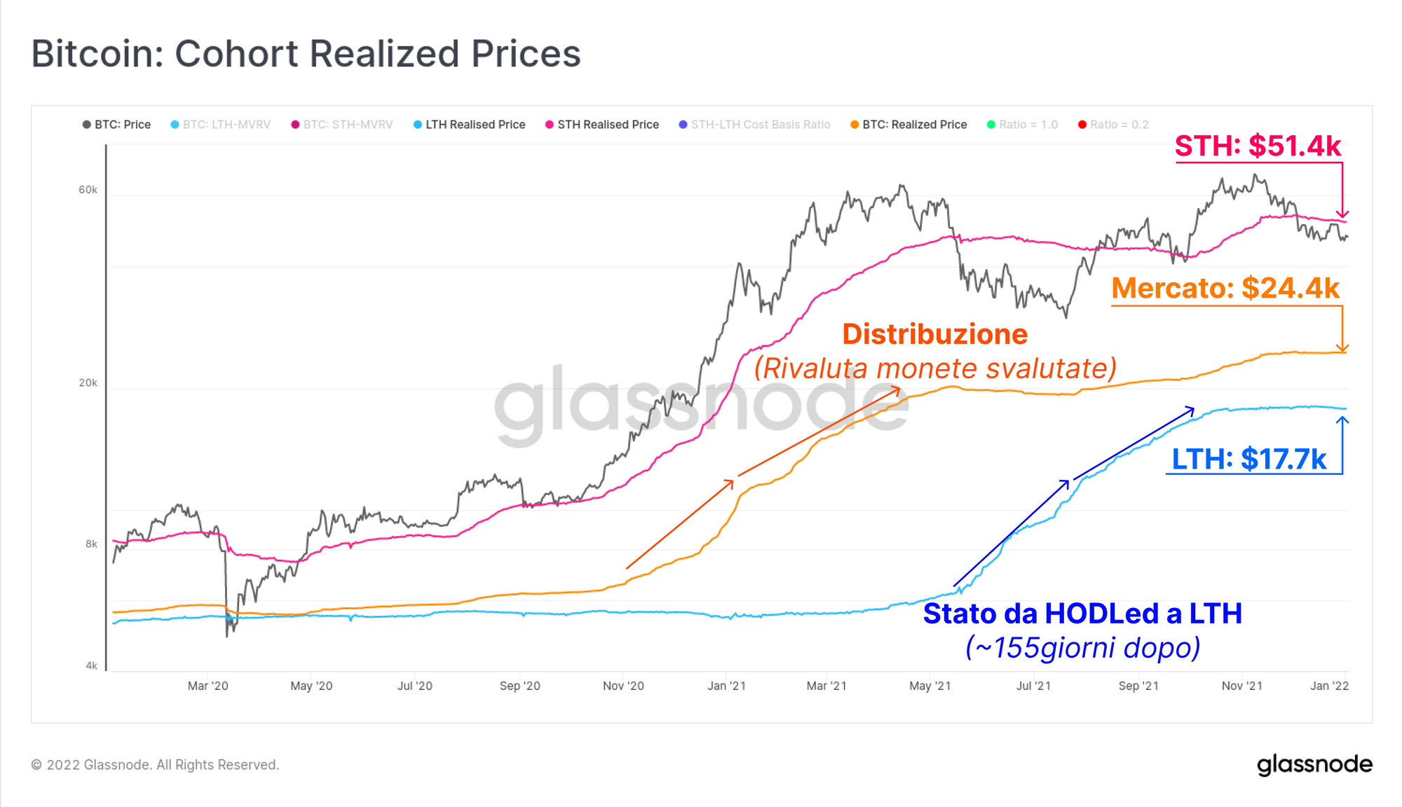 - Long-Term Holders (blu): al momento si trova a $17.7k, dopo una ripida salita dovuta a monete acquisite durante la prima metà del 2021 che non sono mai state spese. Questa metrica può essere considerata una visualizzazione pratica della crescente valutazione di Bitcoin nel tempo da parte dei LTH.