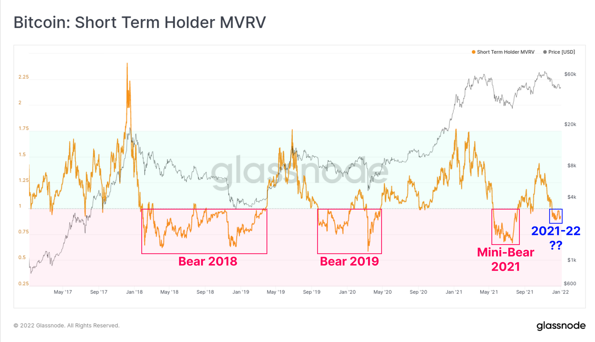 Per quanto riguarda gli Short-Term Holders, la metrica STH-MVRV mostra l’entità delle loro posizioni in negativo relativamente ai precedenti periodi ribassisti. Al momento lo STH-MVRV è al di sotto del valore di 1.0, un evento che purtroppo, dal 2017 a questa parte, non è noto per aver avuto una breve durata. I periodi ribassisti nel 2018, 2019 e metà 2021 hanno visto gli STH costantemente in rosso, con una resistenza fornita proprio dallo STH-MVRV attorno al valore di 1.