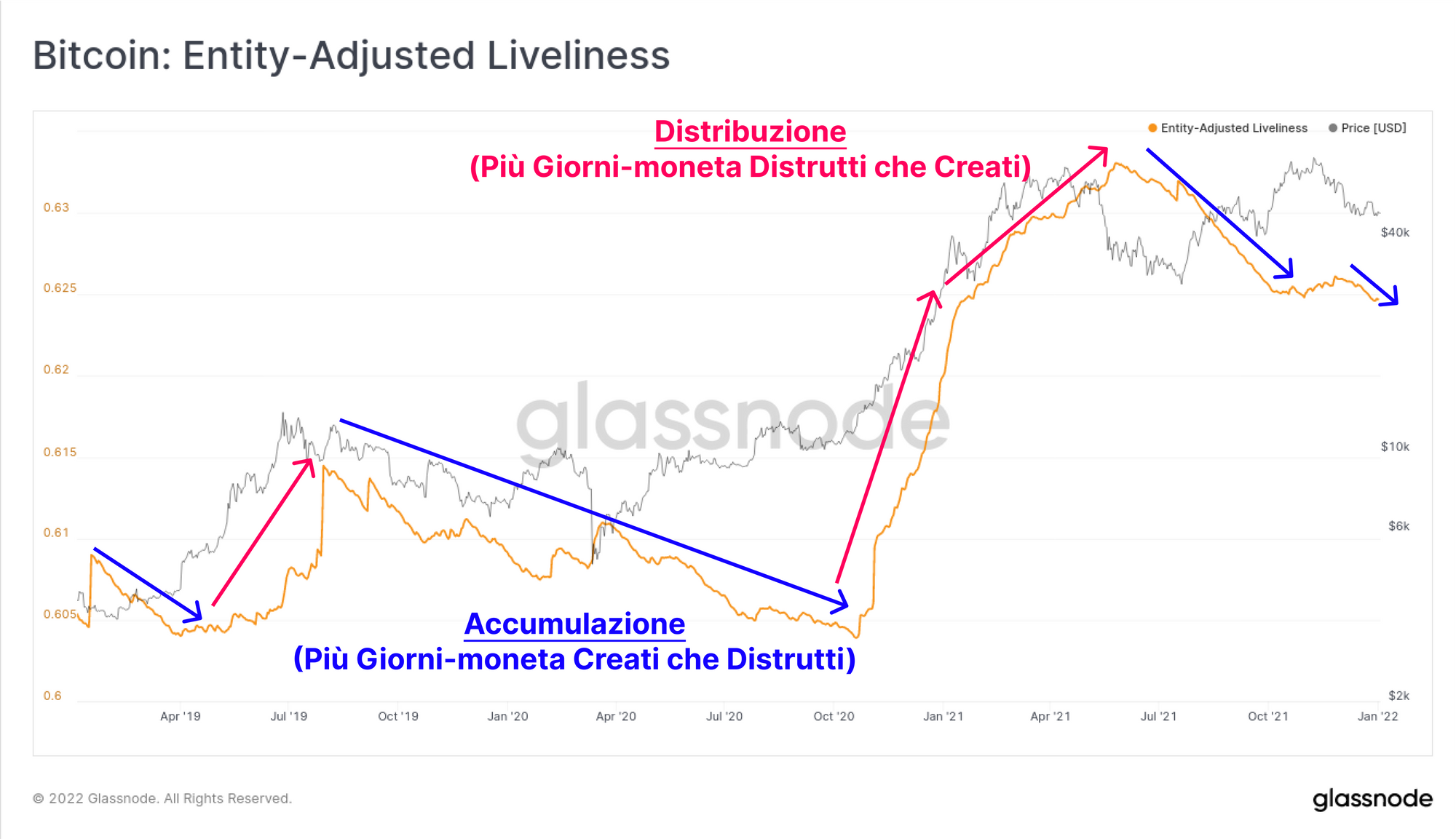 Per concludere gli aspetti legati ai macro trend sul lungo termine, possiamo vedere una confluenza all’interno della metrica Liveliness (vivacità delle monete). La Liveliness riflette la crescita relativa della creazione e della distruzione di coin-days (giorni-moneta) all’interno del circolante. Quando ci sono più giorni-moneta creati, c’è una maggiore dormienza ed HODLing, e la Liveliness tenderà a ribasso (blu). Al contrario la distribuzione, soprattutto da parte delle mani più vecchie, vedrà più giorni-moneta distrutti che creati, e pertanto la Liveliness tenderà a rialzo (rosa).