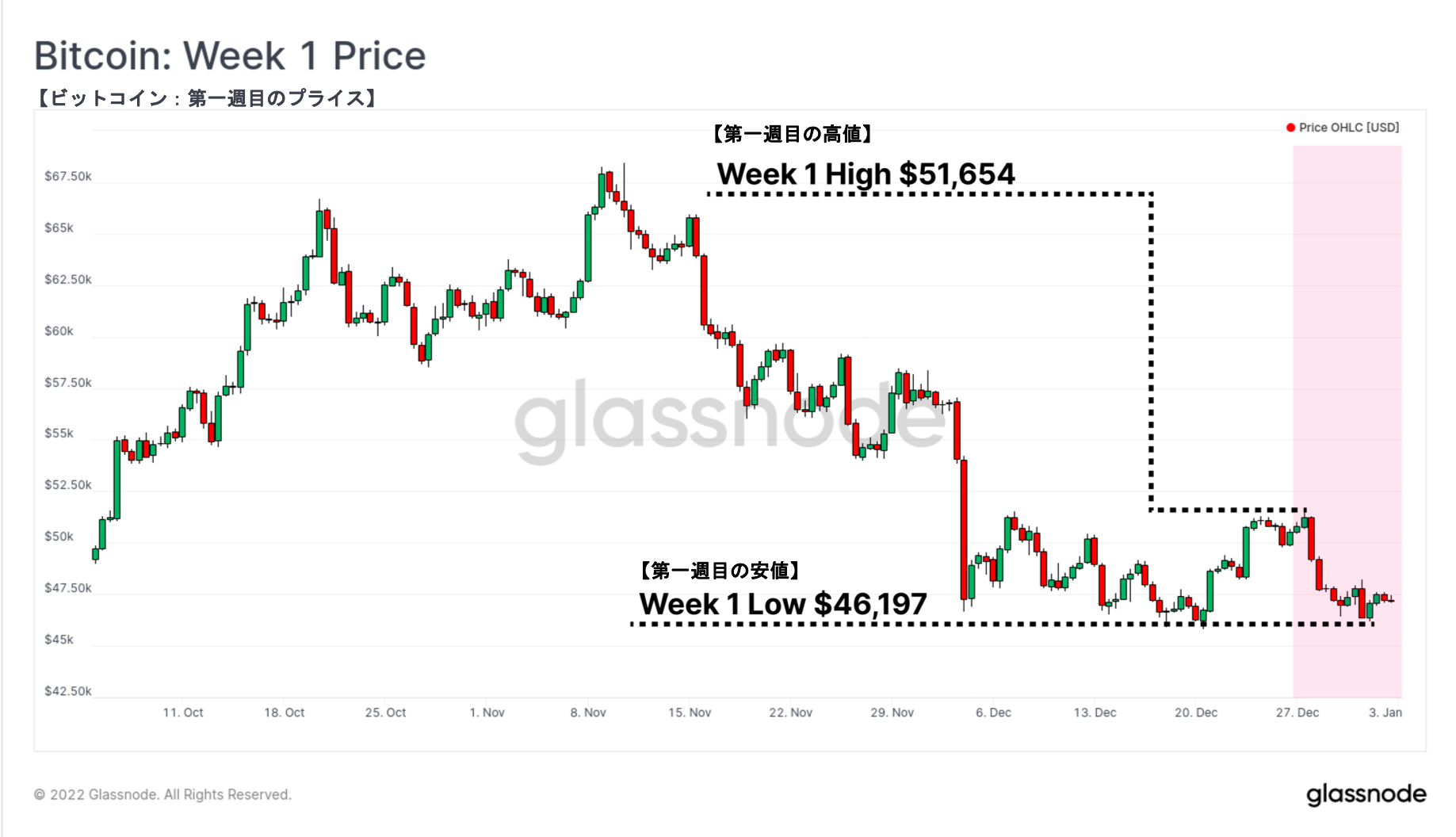 2021年が終わるとともに、ビットコイン市場の活動も落ち着き、取引高は減少、価格はいくぶん横ばいとなった。価格は11月下旬から同じレンジでの取引が続き、今週は高値51,654ドル、安値46,197ドルの間を行き来している。