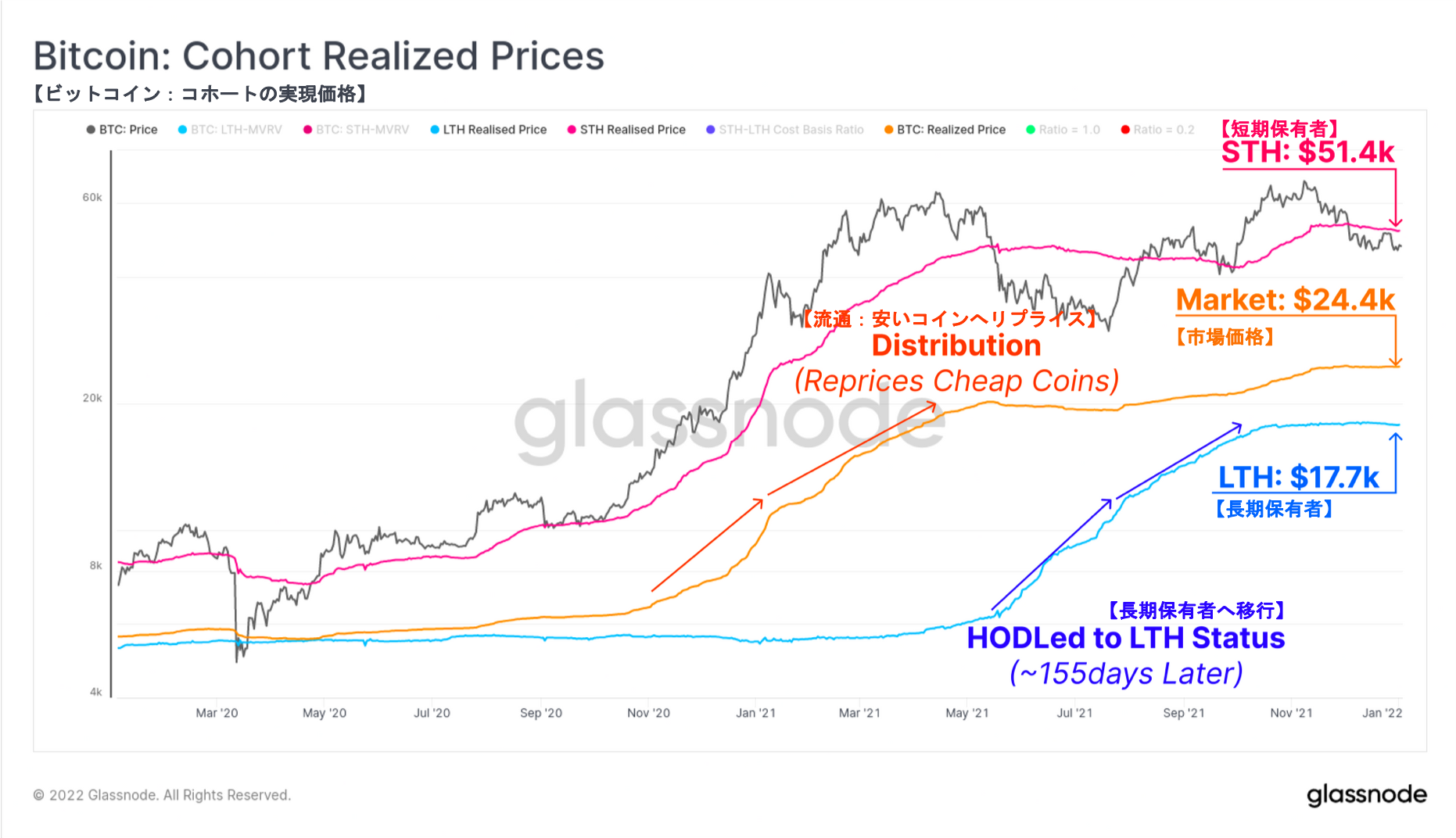 ・長期保有者(ブルー):2021年上半期に高い価格で蓄積されたコインが使われておらず急騰した後は $17.7kで現在取引されている。この指標は、長期保有者が時間の経過とともにより高い下限値でビットコインを評価していることを視覚的に表していると考えることができる。