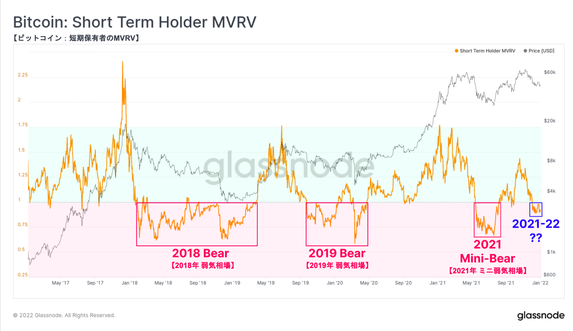 短期保有者コーホートについて、STH-MVRV指標は、過去の弱気期間に対する現在の含み損の苦痛の大きさを示している。STH-MVRVは現在1.0を下回って取引されているが、この事象は残念ながら2017年以降、すぐ終わりになる時期が極めて少ない。2018年、2019年、2021年半ばの弱気相場期はいずれも短期保有者が含み損の状態が続き、STH-MVRV値1が抵抗線として作用している。