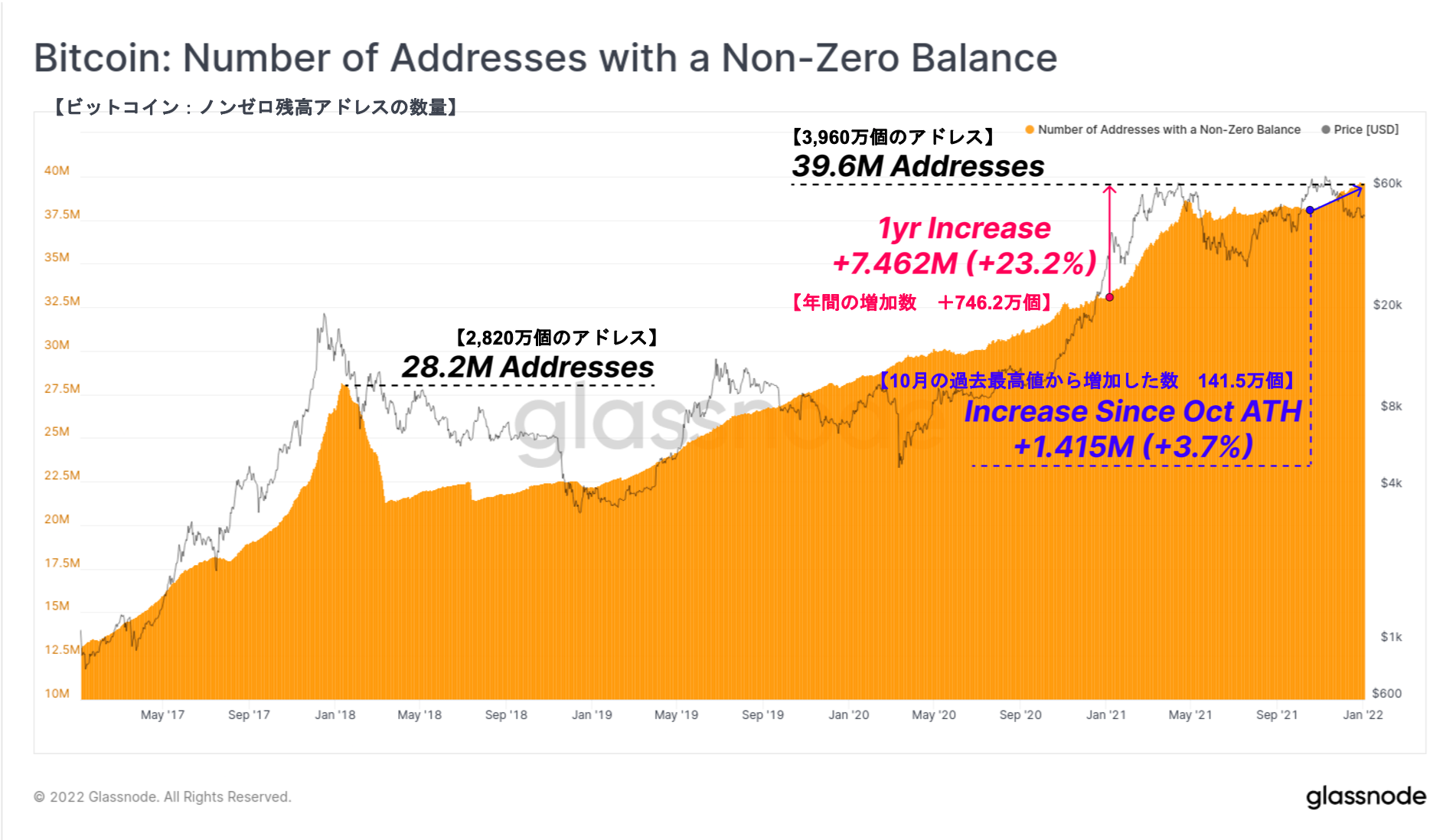 直近のノンゼロアドレスの過去最高数である3960万個は、2017年の強気相場の終わりに記録したピーク時よりも40%増で、過去5年間にわたり利用者数が上昇し続けていることを示している。