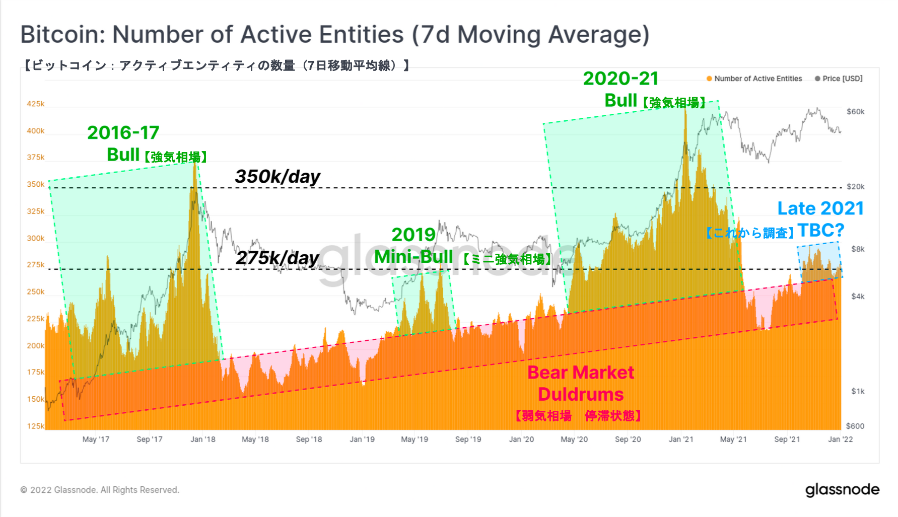 日次のアクティビティを見ると、オンチェーンのアクティブなエンティティ数は、ようやく275k/日を突破することができた。下図の赤いハイライトでは上昇する“弱気相場チャネル(bear market channel) ”が見て取れる。これは、価格が下落し相対的な関心が低下している期間においても、ネットワークユーザーが持続的に増加していることを示している。