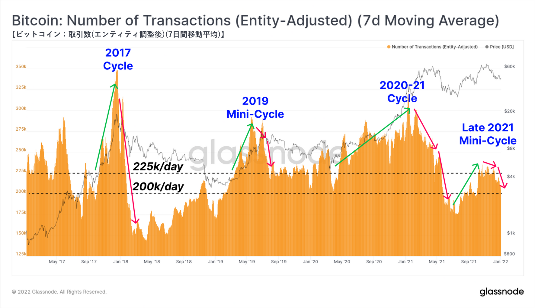 取引件数も同様、2017年と2020-21年の強気相場ではっきりと目立ち、ピーク時には1日あたり30万件以上の取引が記録されている。2019年4月~8月と2021年9月以降の現在の市場には、類似点を見出すことできる。どちらのケースでも、最初の活発な動きが価格の上昇を支えたものの、有用な勢いを維持することができず、取引件数と価格は共に増減している。