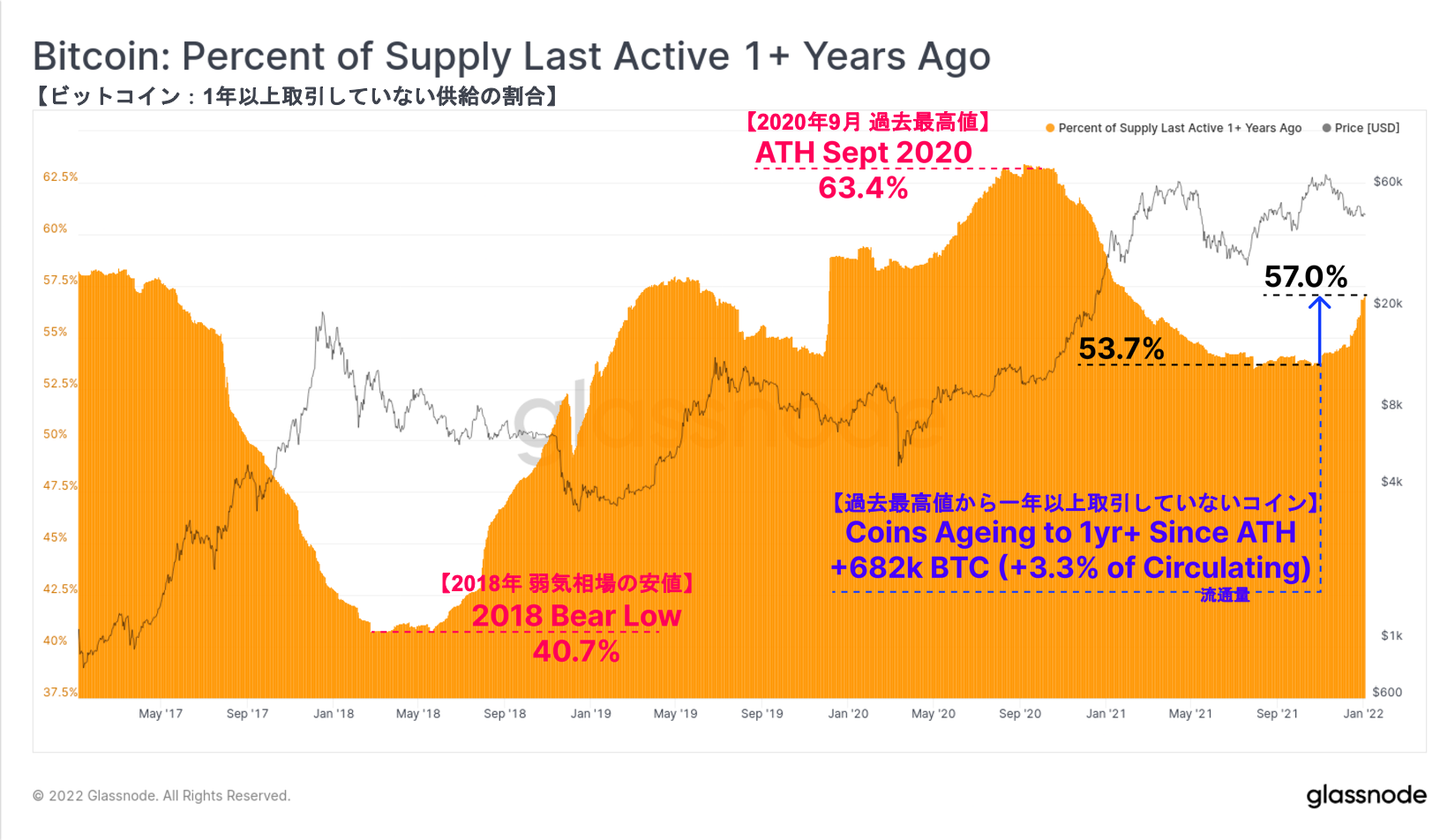 1年超の供給量の指標を見ると、2020年後半に蓄積されたコインの大部分が今日まで使われていないままであることがわかる。2021年10月以降は68.2万 BTC以上が1yr+ age band (訳者記:1年以上使われず経過したコインの数を表した帯。以下グラフ参照)にあり、流通しているコイン供給量の3.3%を占めている。いまやコイン供給量の57%以上が1年以上使われず経過しており、2019年4月の急上昇時に見られた51.5%とほぼ同じである。