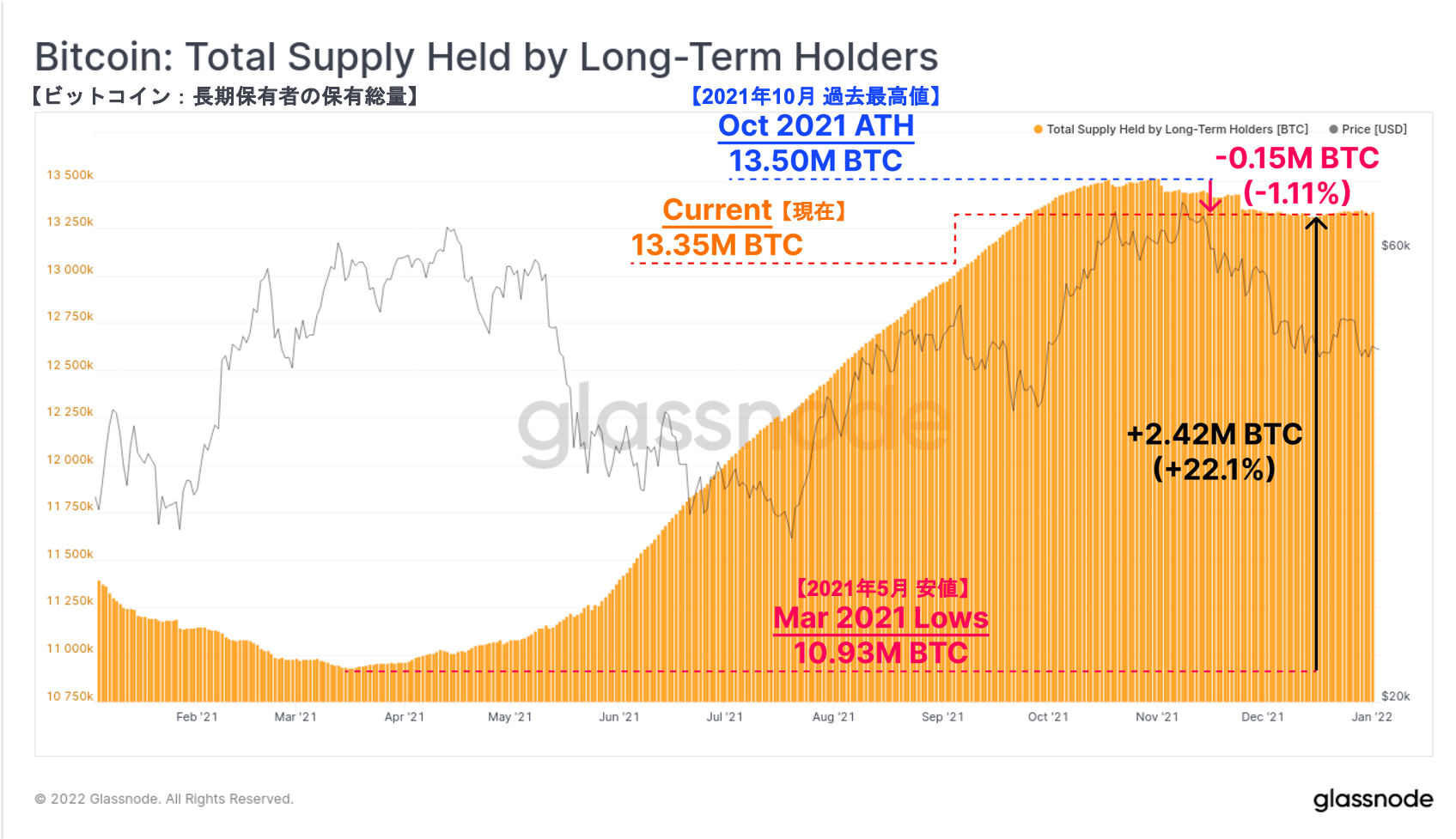 2021年のボラティリティを考えると、これほどの増加と年中保有されていたコインの割合の大きさは非常に注目に値すると言えるだろう。