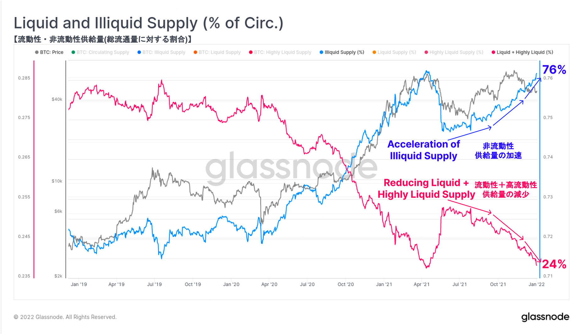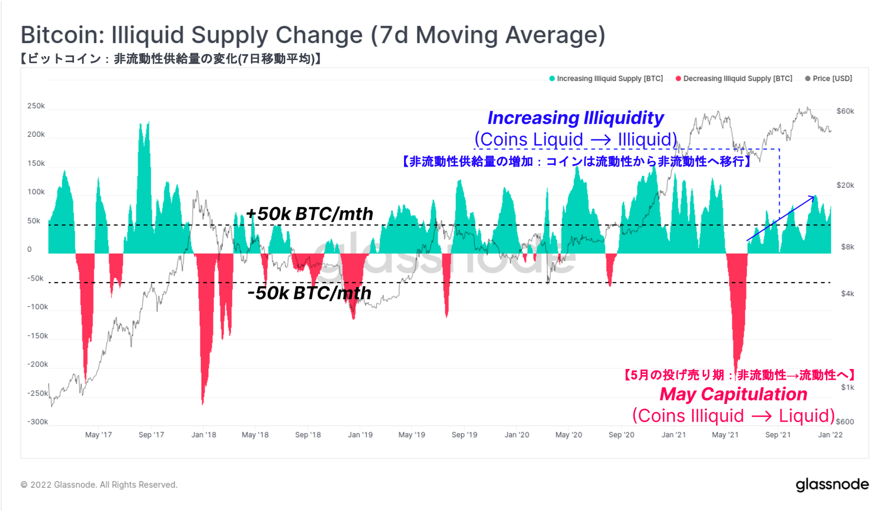 2021年の最後の数ヶ月間は価格が調整されたにも関わらず、流動性ウォレットから非流動性ウォレットへのコインの移動が加速していることが以下に示されている。12月ではコインが50k~100k BTC/月の割合で非流動性のウォレットにますます移動しており、より大規模に蓄積される可能性が高いことを反映している。
