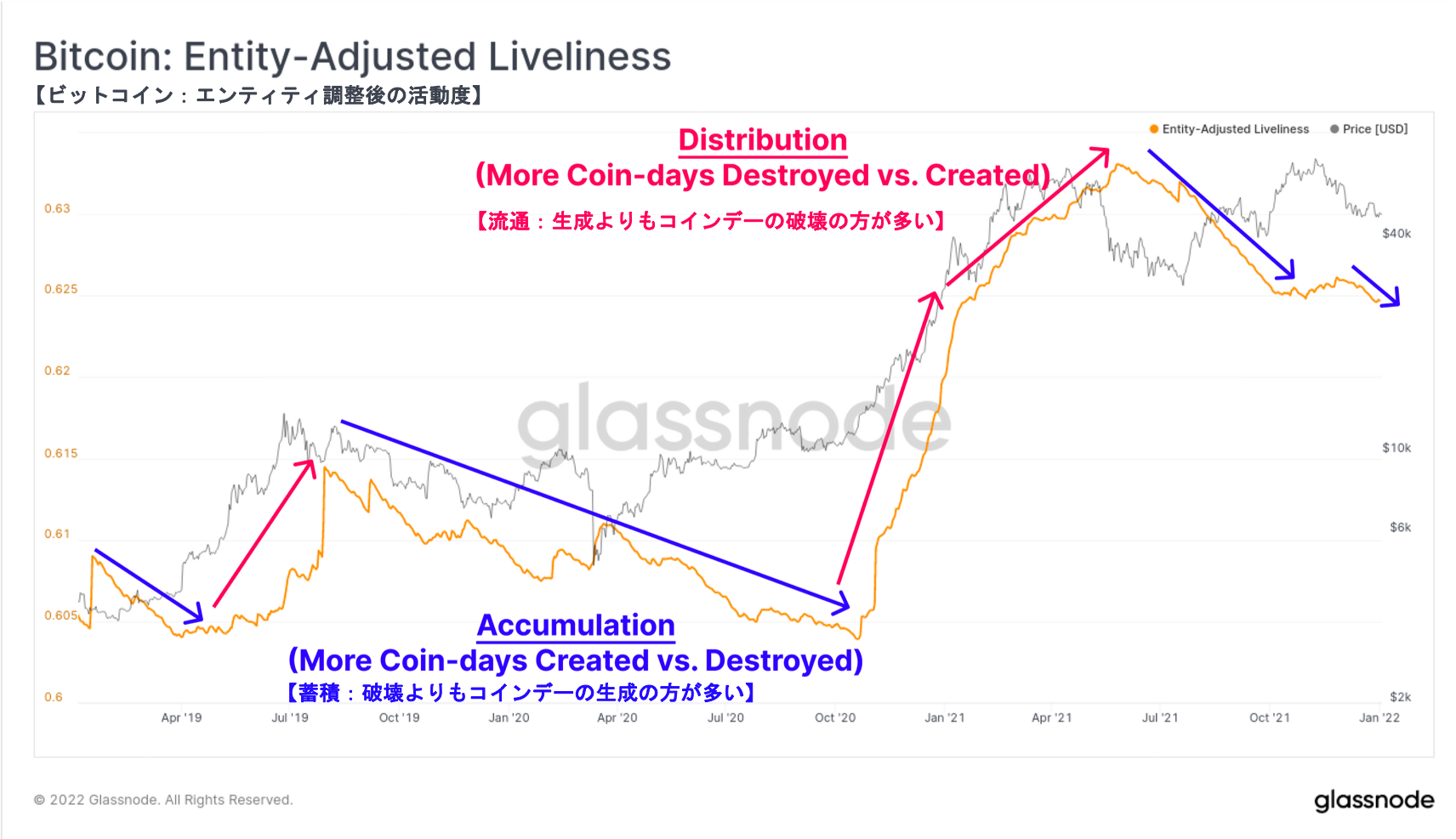 また市場が蓄積期(流動性が低い)または分配期(流動性が高い)といった、現在のコインの動的供給に対してより直接的に測る指標を使用してコインの流動性を評価することもできる。