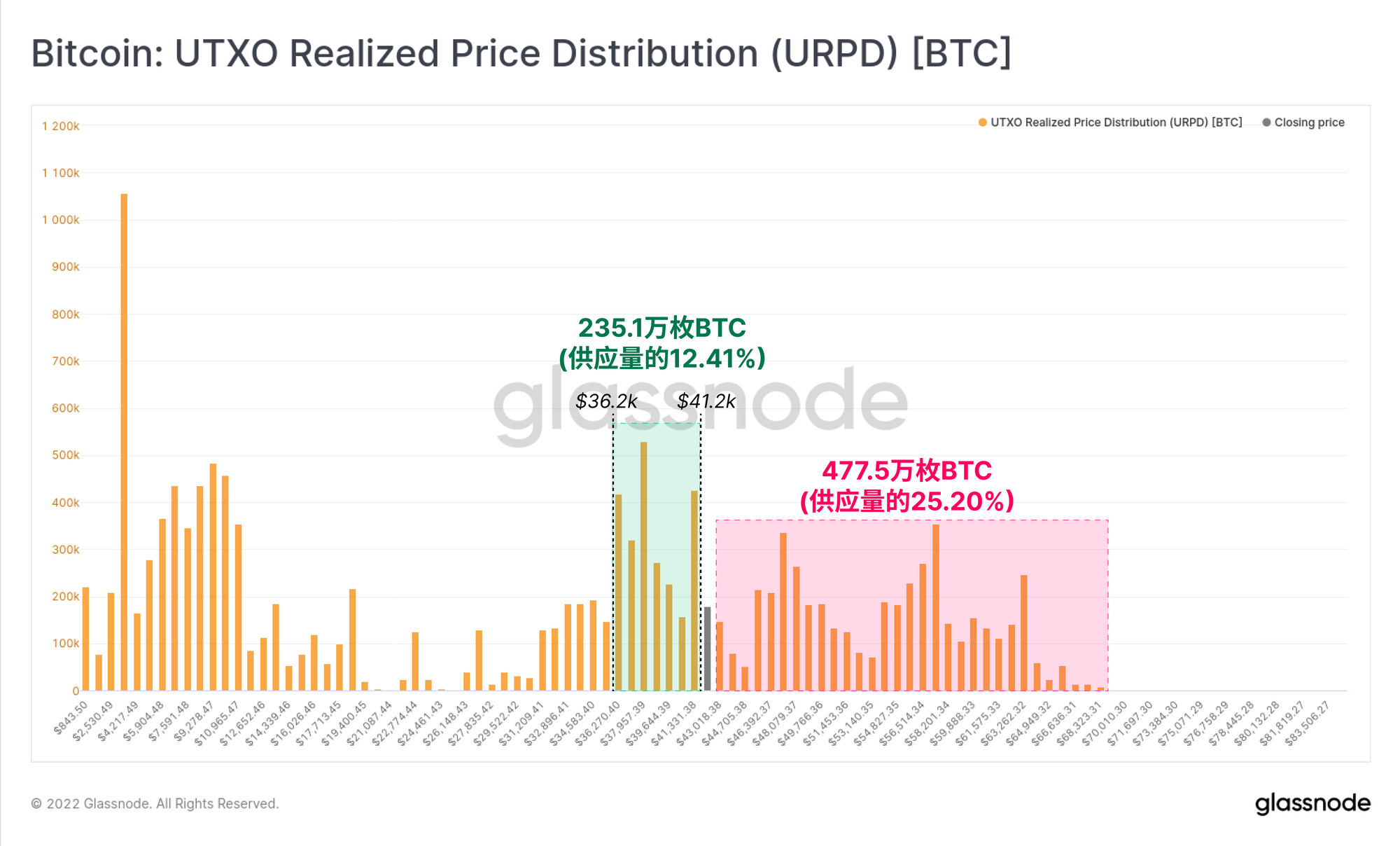 URPD指标显示了当前比特币UTXO集的卖出价格的分布。在指标中我们可以发现,235.1万枚BTC(占供应量的12.41%)最后的交易价格在3.62万美元至4.12万美元之间。即使这些比特币重新在较低的变现价值卖出,市场仍然是头重脚轻,超过25%的流通供应量最后以较高的价格完成了交易。