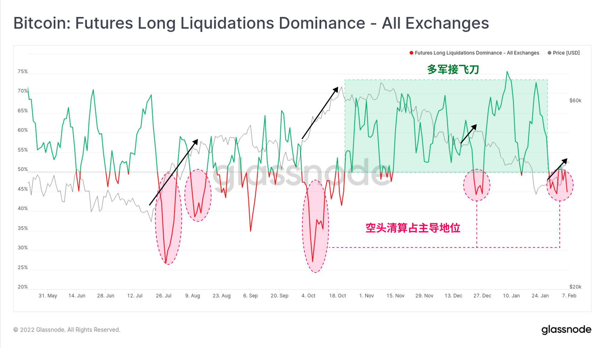 随着市场的走高,推动它的一个机制可能是对后期进入的空头的轧空,我们已在上周的版本中做过讨论。多头清算占比图表显示,本周空头一直处于不利状态,对空头清算趋势略微占据上风。