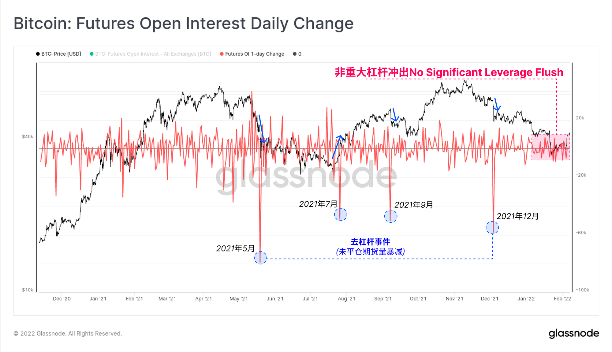 在很大程度上,期货未平仓合约的1日变化证实了这个猜测,我们还没有发现去杠杆化事件的典型特征,即大量未平仓合约被强制平仓。然而,期货未平仓合约仍然占比特币市值的1.91%左右(约150亿美元),位于高位。