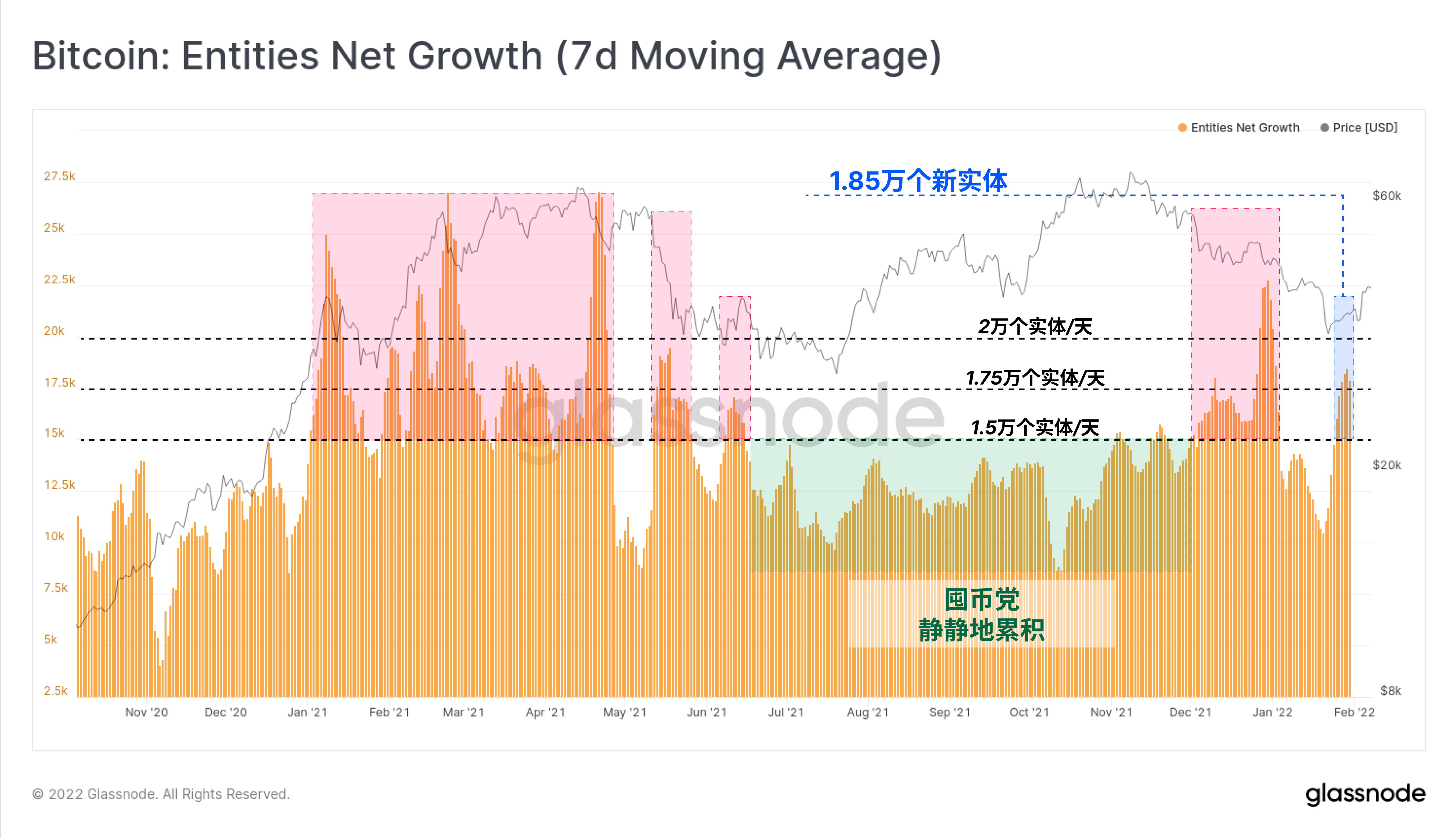 2021年6月至12月是一个安静的积累期,每天有12.5万个净实体进入网络。因此,最近在1月和2月的高峰可能表明,在交易下降到更有吸引力的进入价格后,暂时过渡到由囤币党主导的积累,或者至少对比特币重新产生兴趣。