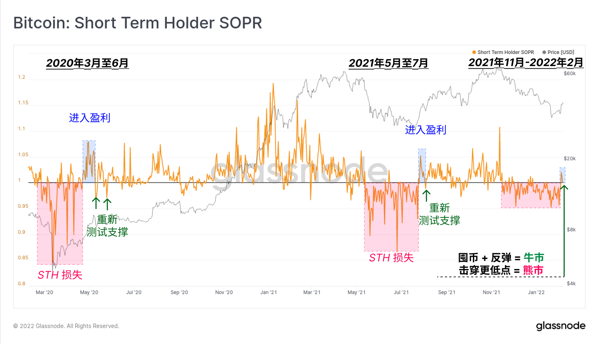自2020年3月以来,我们可以在两个实例中看到类似的STH-SOPR模式。在长期的损失之后,市场成功突破了看涨的上升趋势,STH-SOPR指标重新测试了1.0。如果STH-SOPR指标再次破高,表明重新获得盈利,需求开始流入并买走比特币。相反,如果回到1.0以下,将是一个看跌的指标,并表明没有足够的需求来支持STH的卖压。