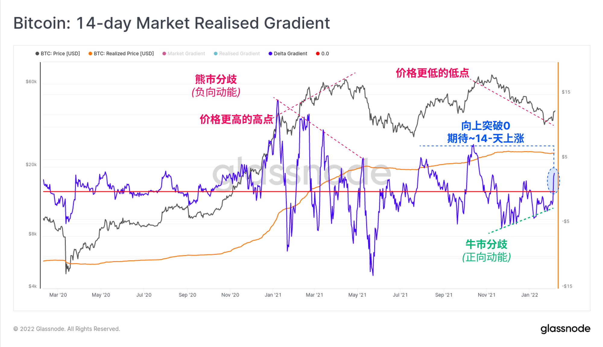 我们还发现,在14天的市场实现梯度(MRG)震荡指标上,出现了相当引人注目的看涨分歧。这个指标模拟了市场定价相对于自然资本流入的动力程度,在实现上限中得到体现。一般解释如下: